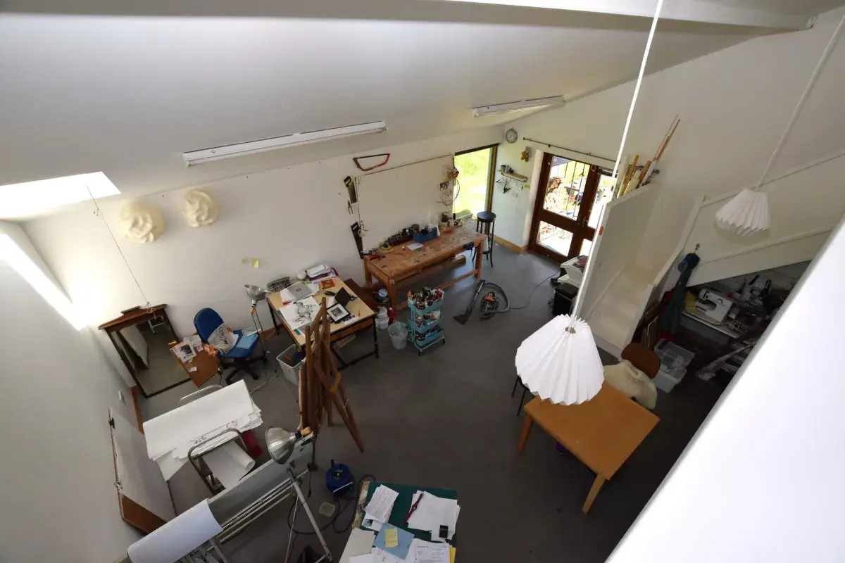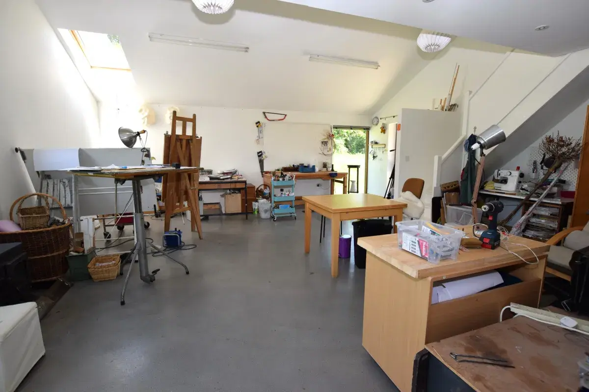 Elsewhere, you’ll find a separate, self-contained, independent apartment unit with its own bathroom, bedroom, and kitchenette. This space is heated by means of a wood-burning stove and separately zoned geothermal heating.