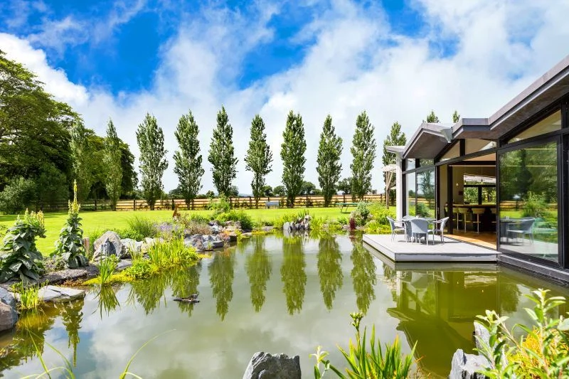 Sliding doors at the centre of this open-plan space open onto a large pond, filled with rainwater, with a floating deck area. The landscaping was designed by the award-winning team at Mount Venus Nursery and extends through much of the property and includes a large vegetable garden too.