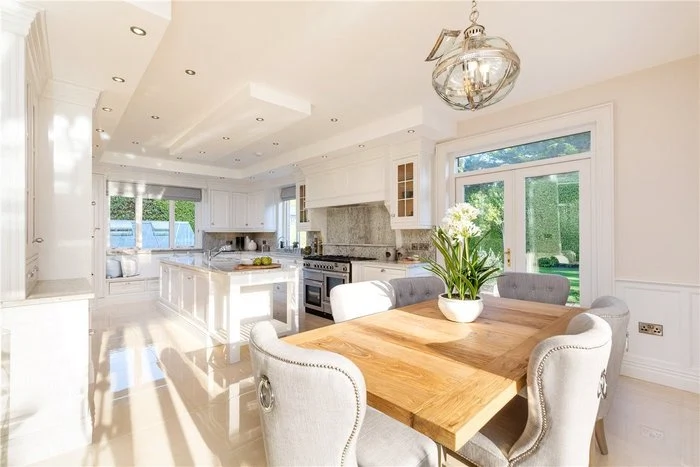 There is a window seat, floor-to-ceiling storage along one wall, as well as a large island with a granite countertop, perfect for cooking preparation. A Rangemaster six plate gas cooker, a prep sink and an Electrolux freezer are all ideal for keen cooks, and French doors in this room also lead out to the garden.