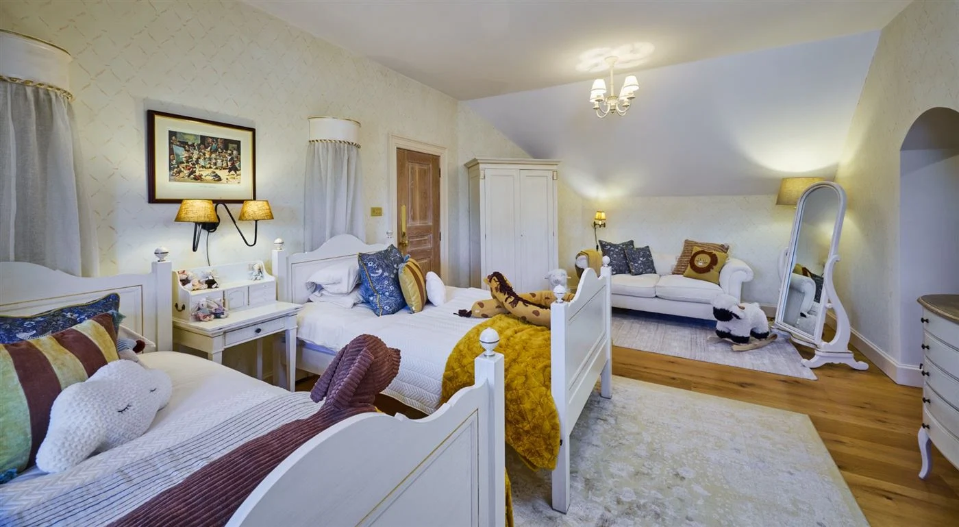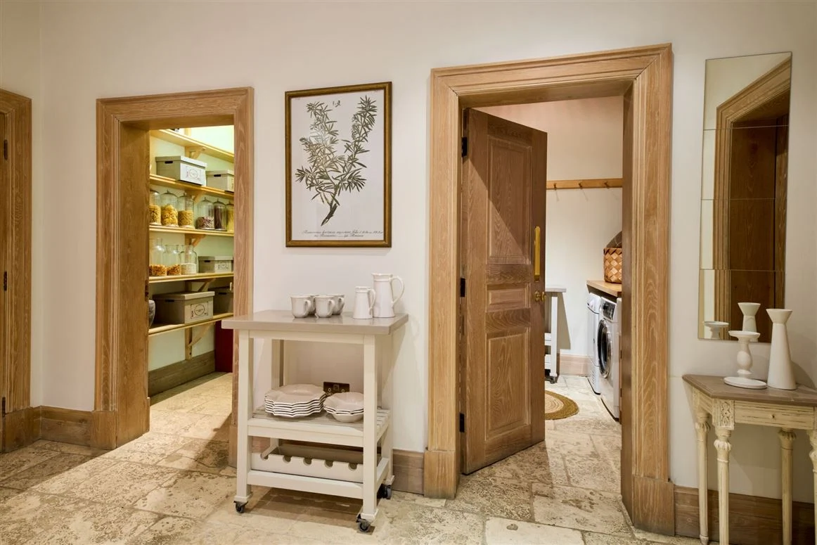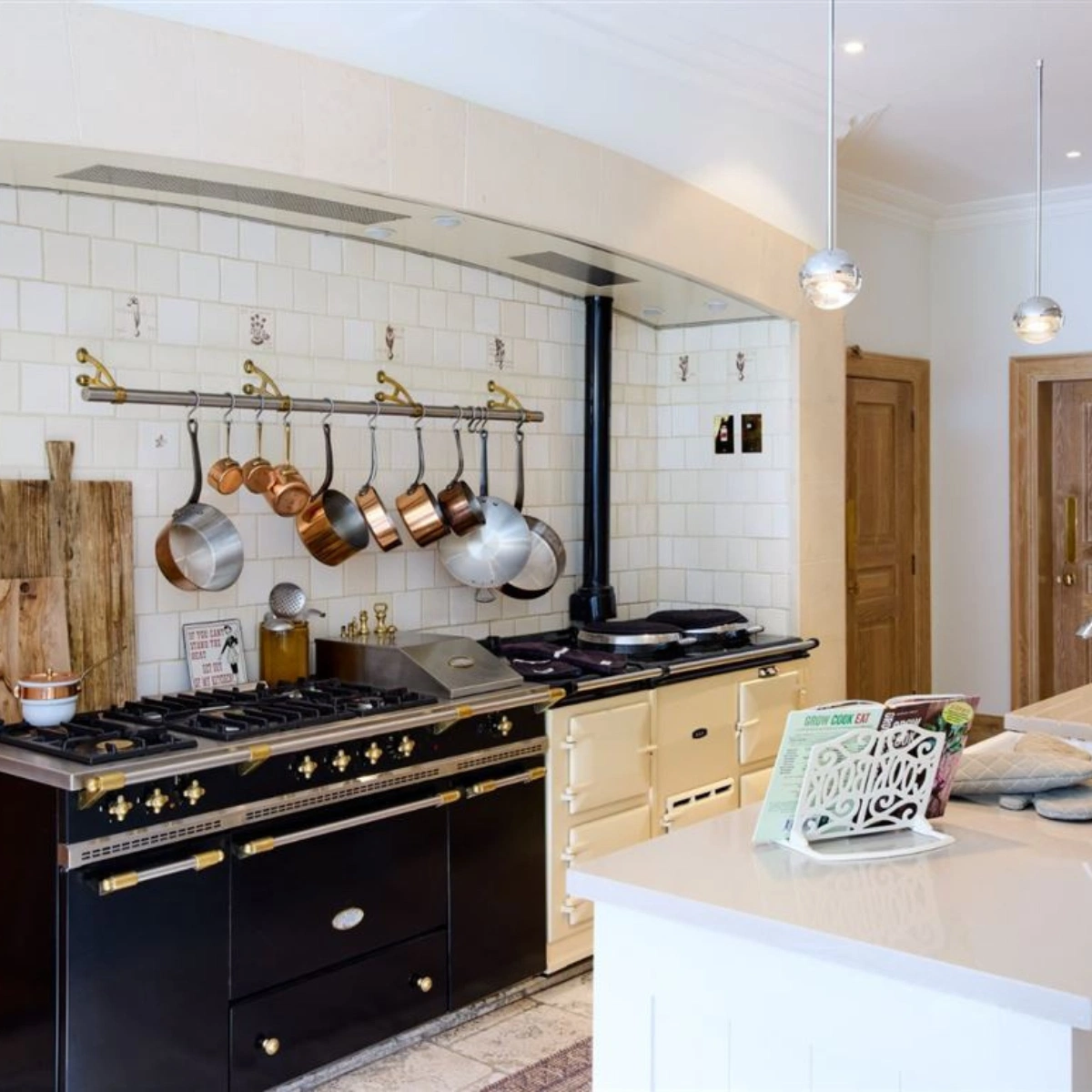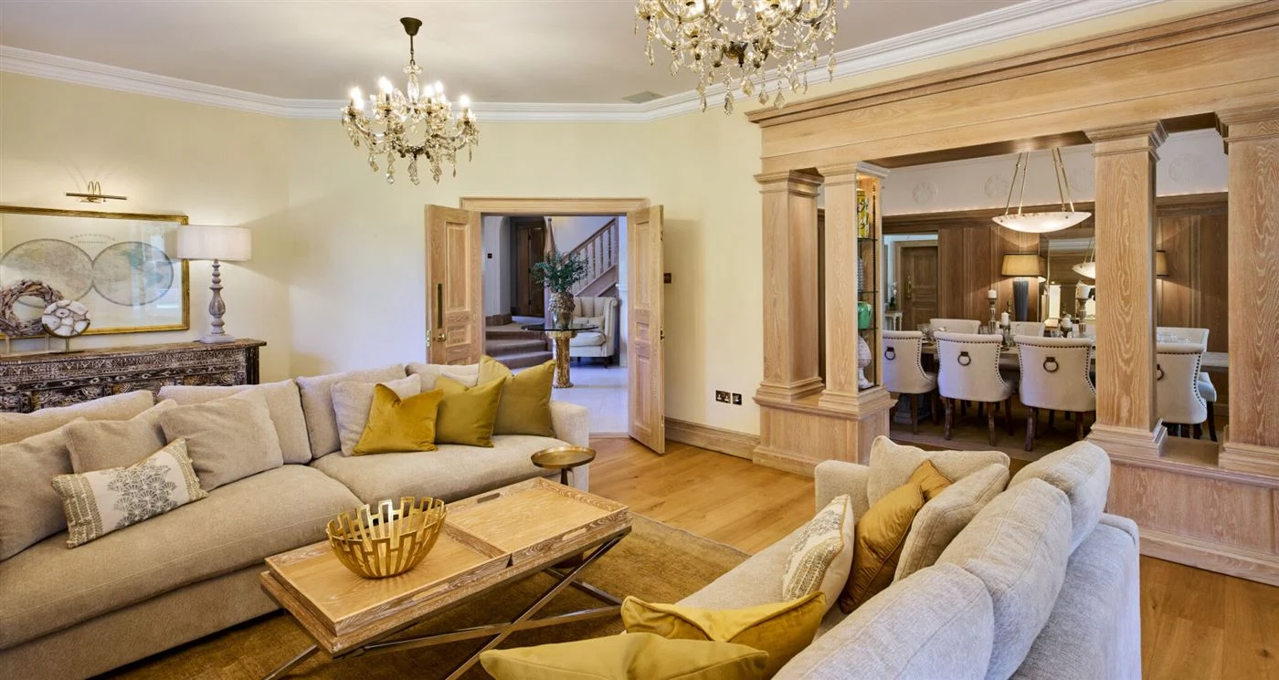 On entering the hall with vaulted ceiling and copper chandelier, a sandstone fireplace with double height sandstone chimney draws the eye upwards, to the galleried landing with limed oak banisters, setting the tone for what lies within.