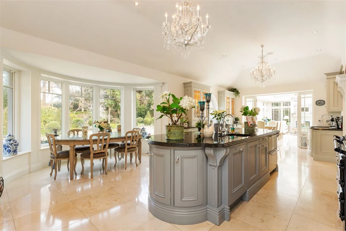 The bespoke kitchen by Christoff Kitchens bears all the hallmarks of luxury interior design. A traditional kitchen with a strong contemporary accent provides the perfect backdrop for creating this laid-back, stylish family hub, hand-painted in a neutral tone and offset by dark oak inlays and black granite countertops with waterfall edges.
