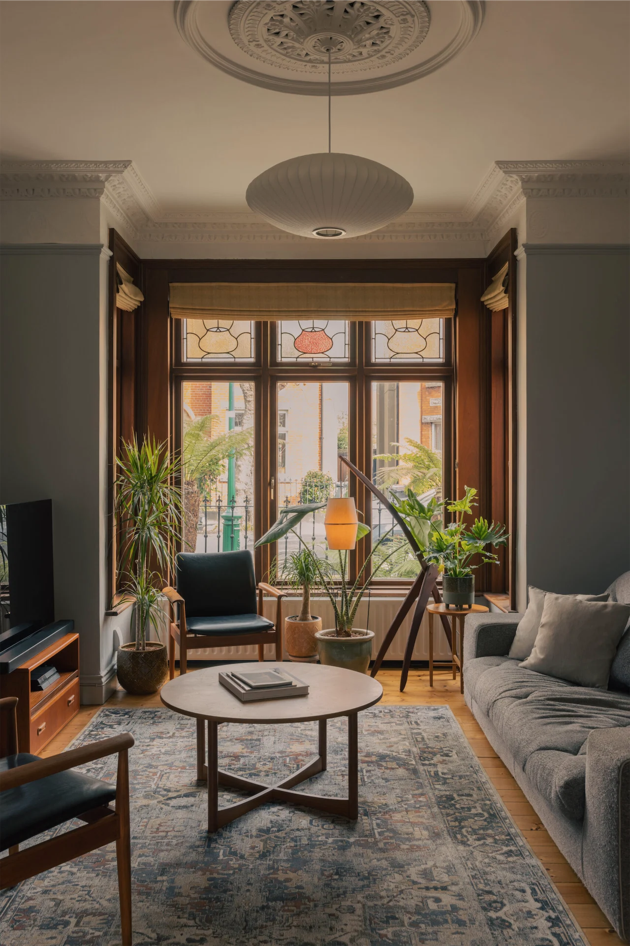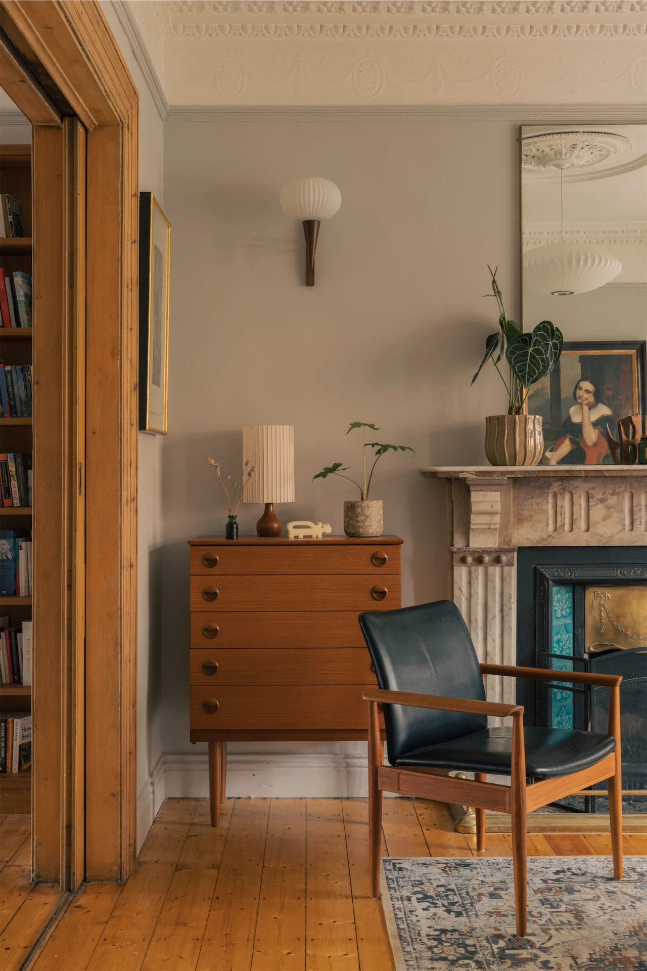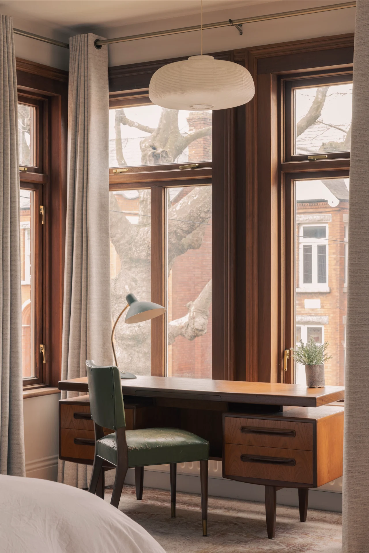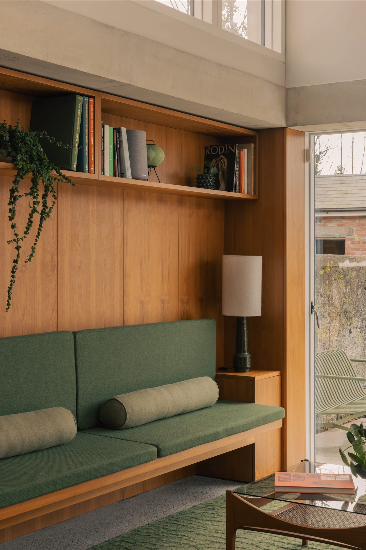 Luke and Gauthier also brought their aesthetic skills to the project, working with Ryan on lighting built-ins, selecting all the soft furnishings themselves and bringing select mid-century pieces out of storage. In the living room sits an early prototype lamp of their own design. The pair have developed their own lighting brand, House Five, which combines rice paper lanterns made by Gauthier in his home office, and curved hardwood bases made by Luke in a small brick workshop Gauthier built in the garden.