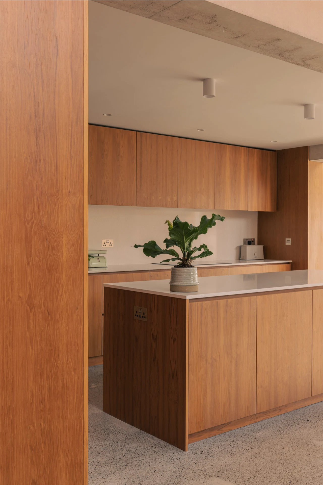 In the design process, several timber options including walnut, stained oak, mahogany and iroko were considered, but the clients were keen on teak due to their existing mid-century furniture pieces. Stuart Malcolm from SM Wood Design, who Luke and Gauthier had worked with on their previous home and who had made their wardrobes here, was enlisted.