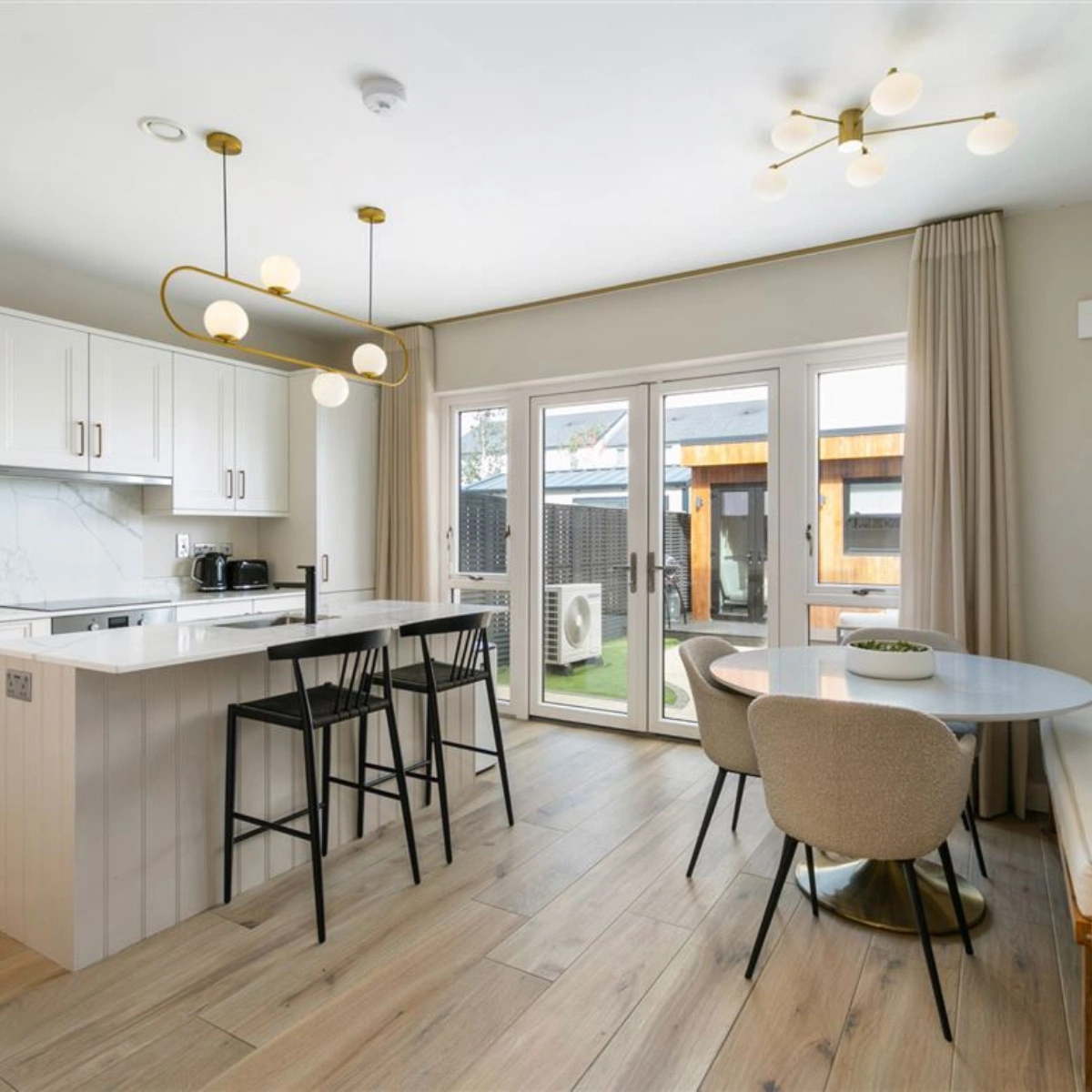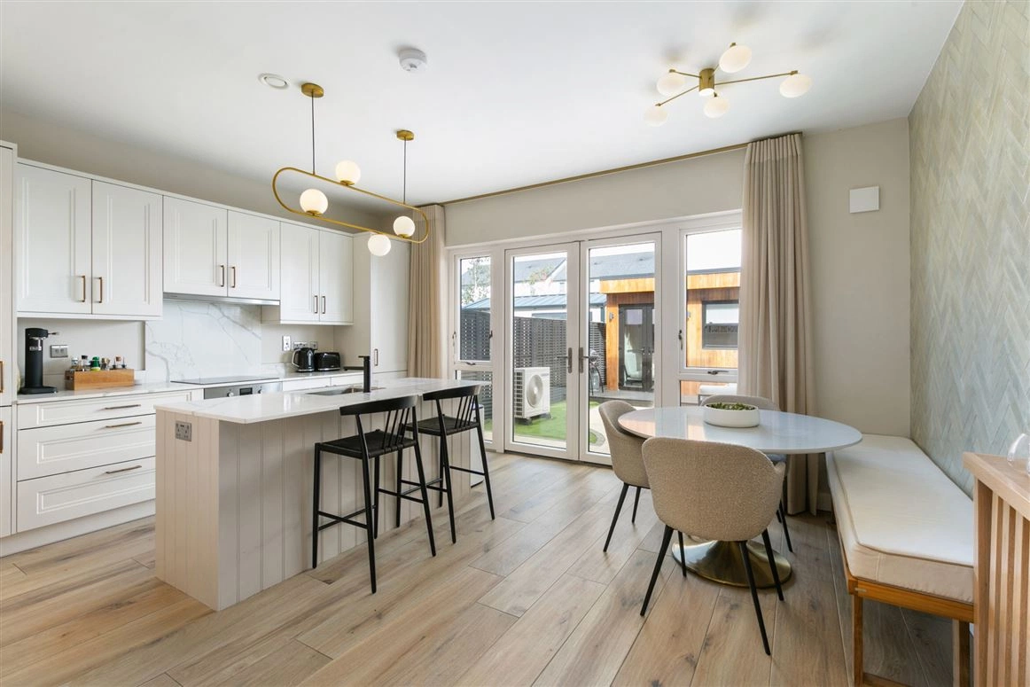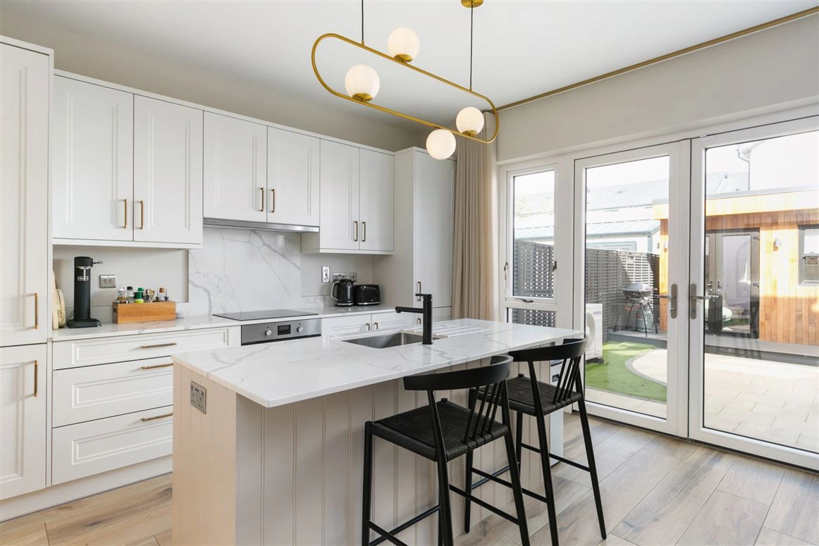 The open-plan shaker-style kitchen/dining room is located to the rear of the building, extending the full length of the property. The kitchen features a wealth of base and eye-level storage units complete with velstone quartz countertops and an American-style island. A custom-made pantry boasting additional storage is located adjacent to the kitchen. French doors from the dining room lead out to the garden.