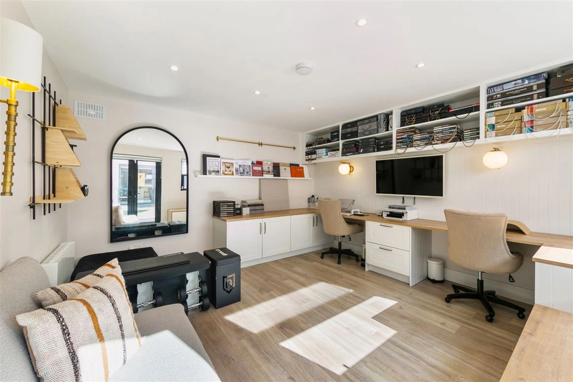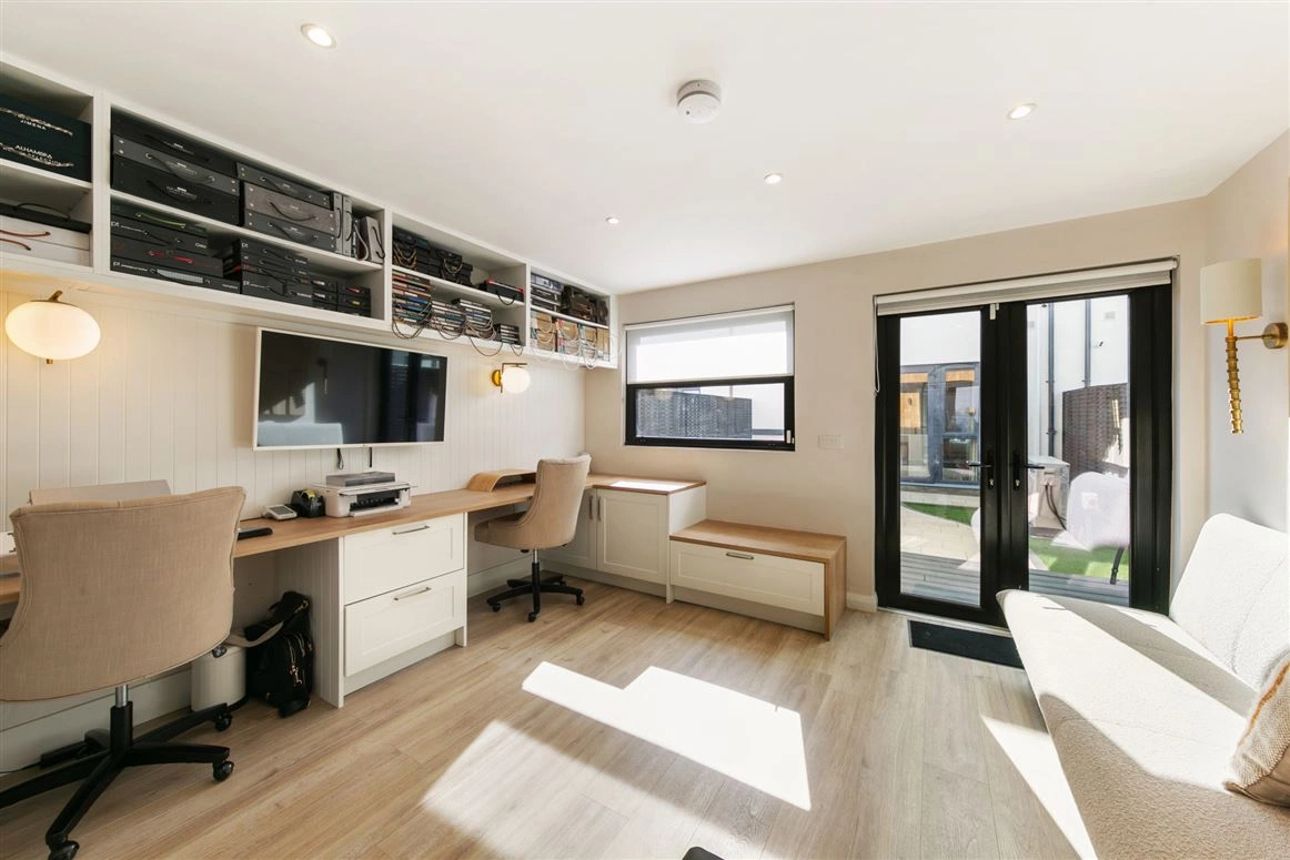 Outside, there is a designated car parking space equipped witha a Pedestal EV Charger to the front of the property, while to the rear is an enclosed, landscaped garden with a state-of-the-art garden/office room at the bottom. Currently used as a design studio, the space would suit a number of different uses from home gym to children’s playroom depending on new owner’s needs.