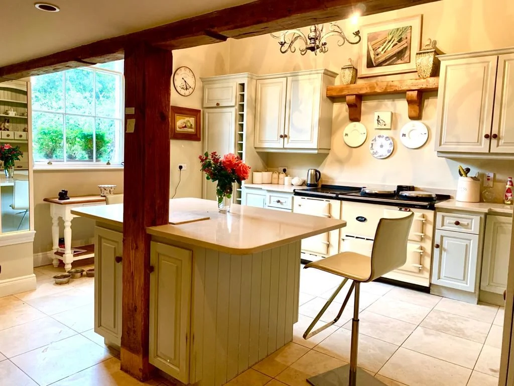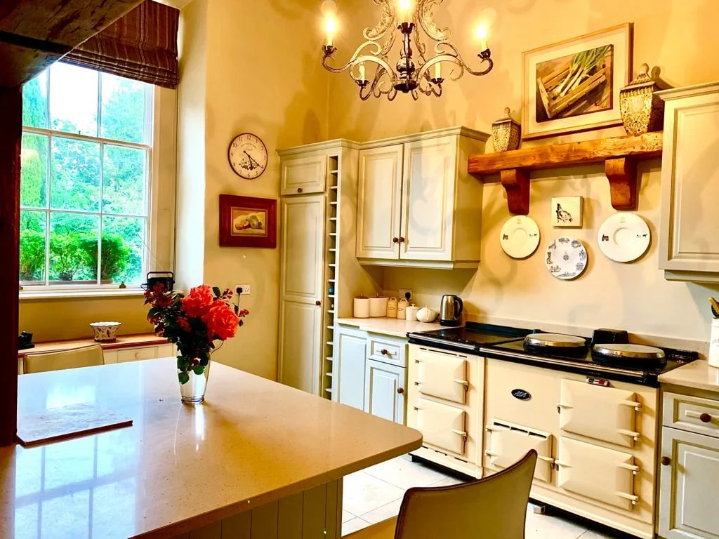 The muted hues continue here with a cream oil-fired Aga surrounded by cream quaker kitchen units, a double Belfast sink and Corian worktops. The ceiling height is split here, with the kitchen area getting the full breadth of the Georgian proportions, while the more casual dining area is cosier, with a lower ceiling that caters to a first-floor return. There’s also a large utility with its own door onto the rear courtyard.