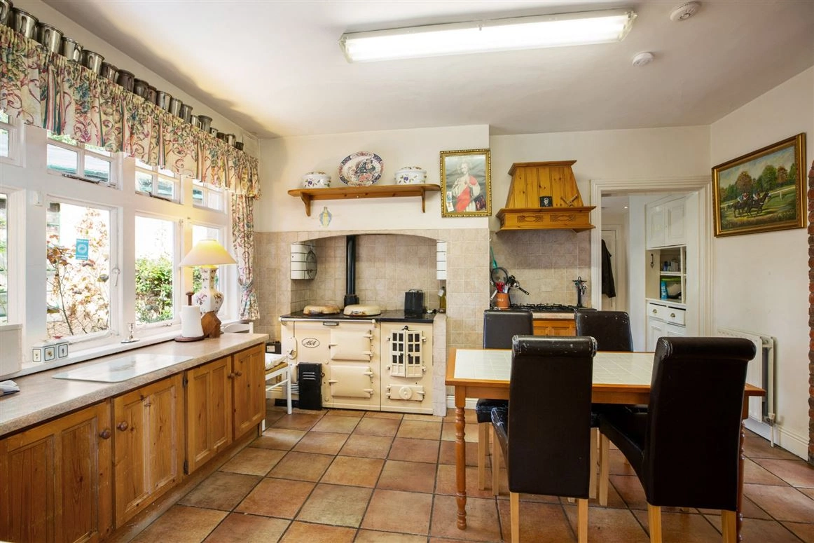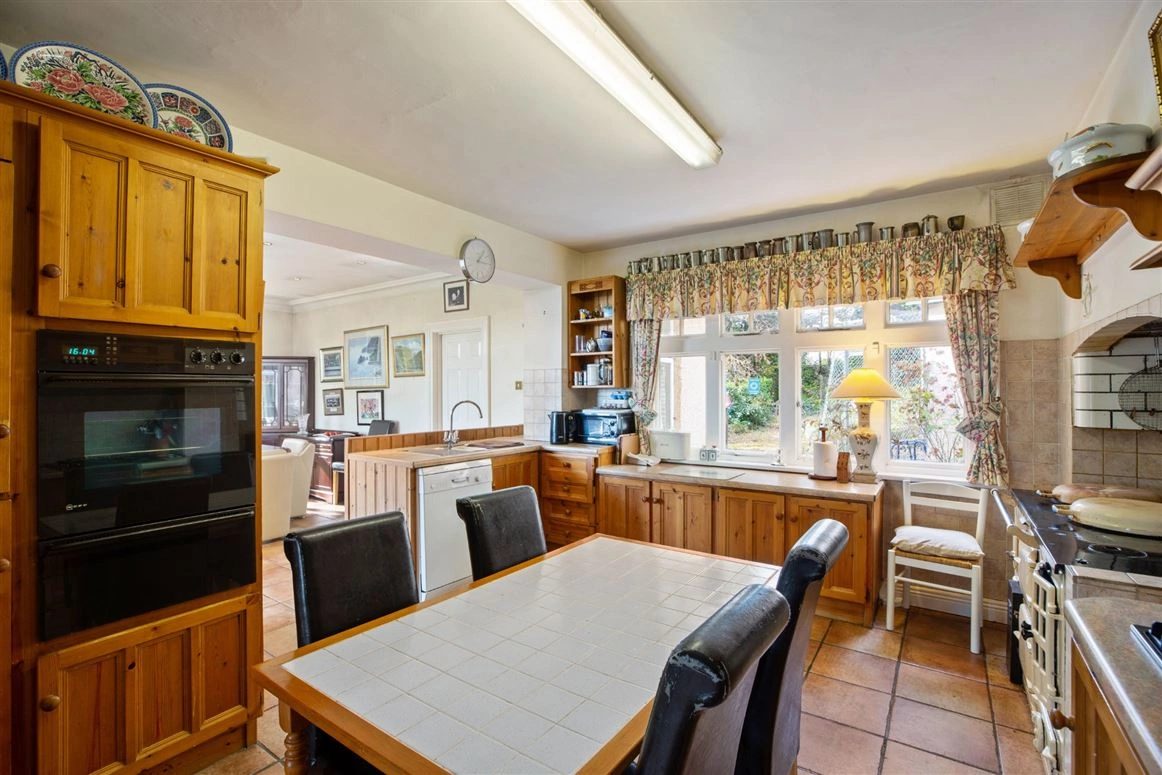Further inside, you’ll find the more informal family accommodation which comprises of a snug family room, located off the kitchen, with access to the sunroom. In the kitchen, you’ll find wall and floor pine kitchen cabinets, a Neff double oven, an AGA and a stainless steel sink unit with a single drainer.