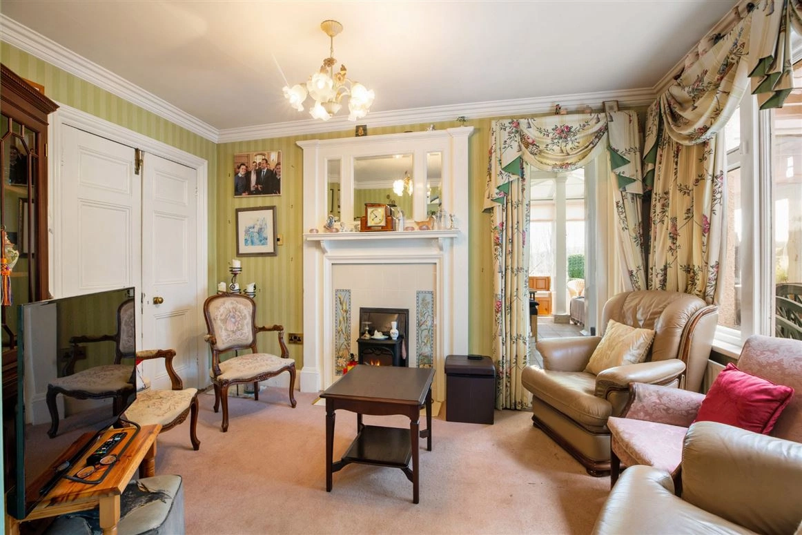 A gravel driveway leads up to the front of the property which features a generous parking apron with access to a double detached garage. An unassuming entrance doorway opens out to reveal the wonder of this fabulous, detached family home. The entrance hallway exudes warmth and period charm with parquet flooring, vertically striped wallpaper and delicate detailed plasterwork.