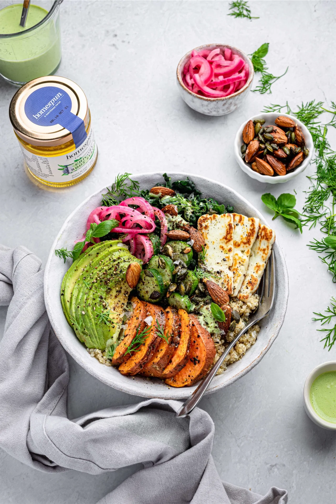 2 Load up bowls with sweet potato, quinoa, halloumi and greens. Top with avocado, pickled onion, seeds and/nuts and drizzle with dressing.