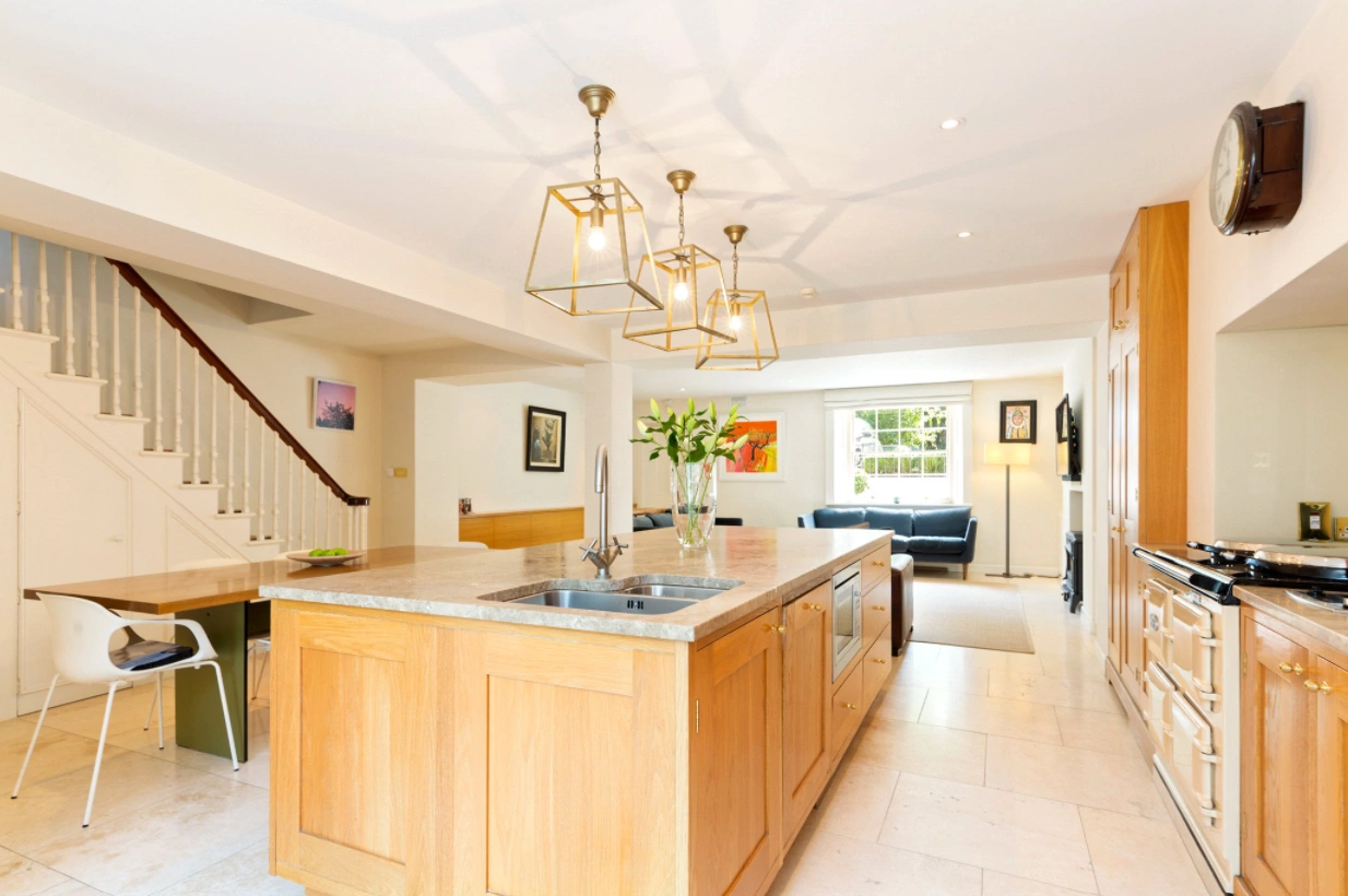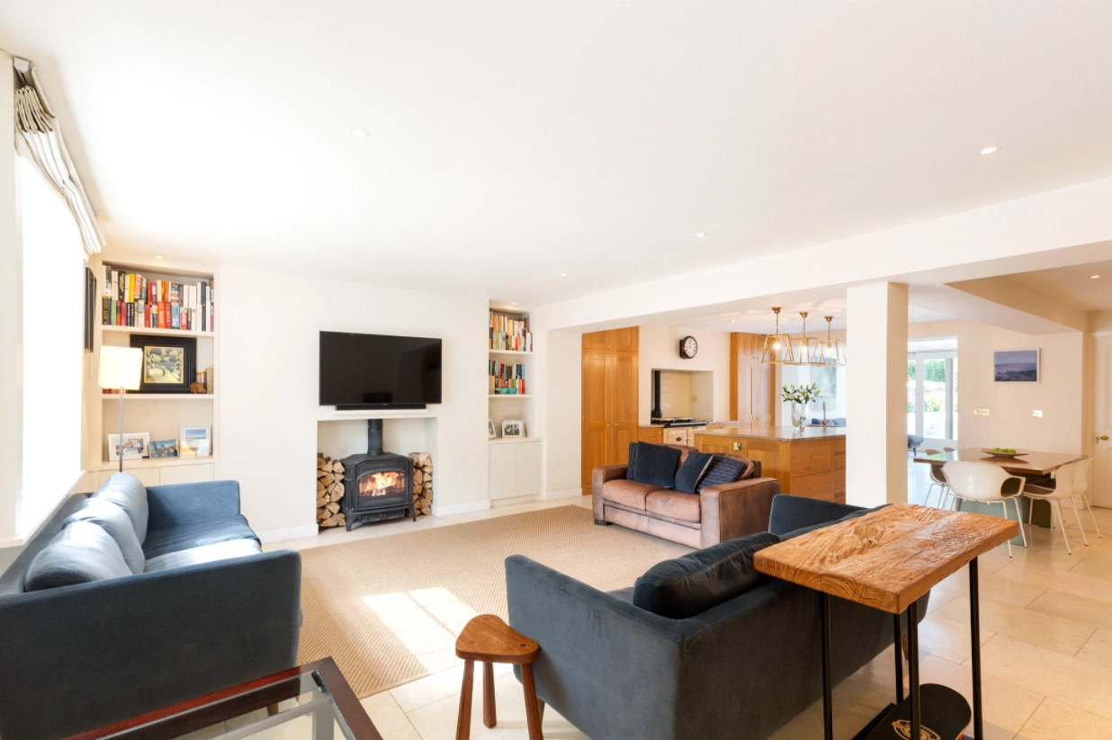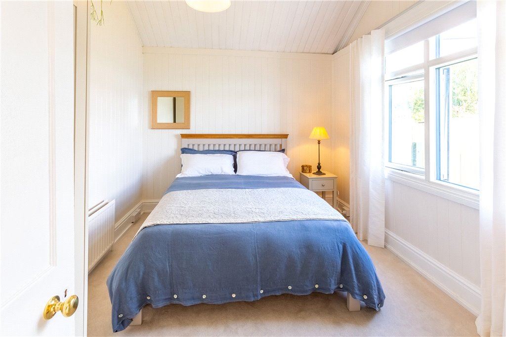 The three bedrooms are in a similar style to the rest of the house, with the main bedroom having a fireplace and a wall of built-in storage, as well as wooden panelling that has been painted in a soft, neutral shade.