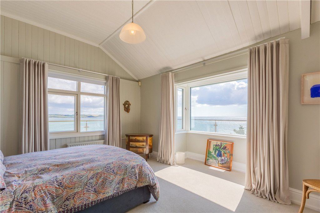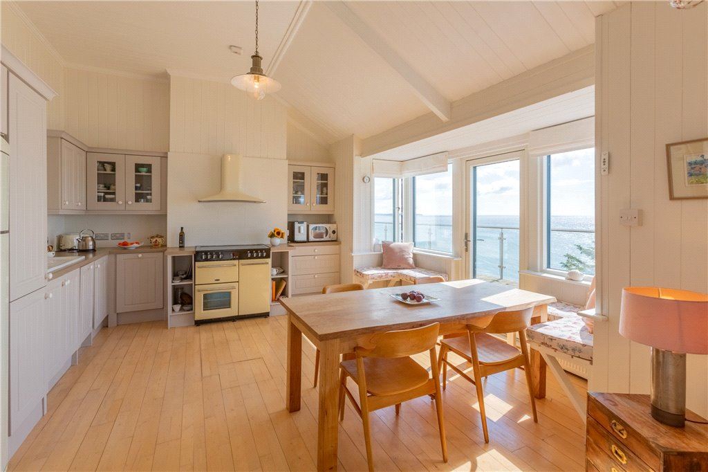 The kitchen is a main feature of this home. With its high, vaulted ceiling, wooden panelling, sea views, and a door out to the deck, it’s a space you would naturally gravitate to. Just off this space, through wide, bi-folding doors is a living room that also enjoys views of the water.