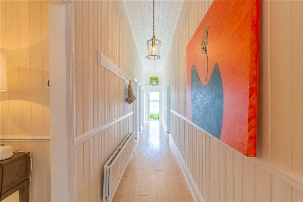You enter the house into a tiled porch, leading to the hallway. A window at the other end gives you a glimpse of the sea view that awaits, and the high ceilings and wood panelling in this space make it feel bright yet warm.