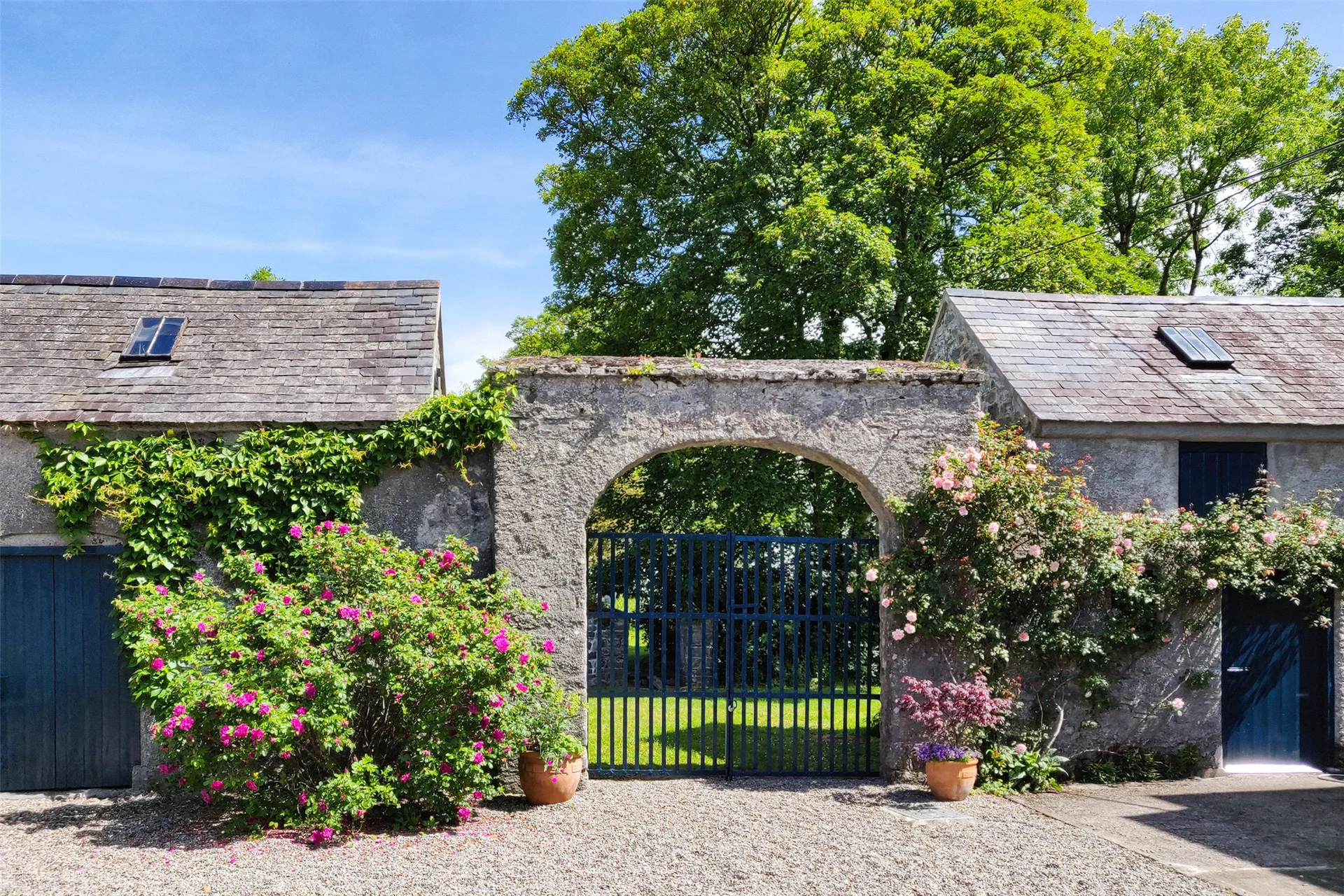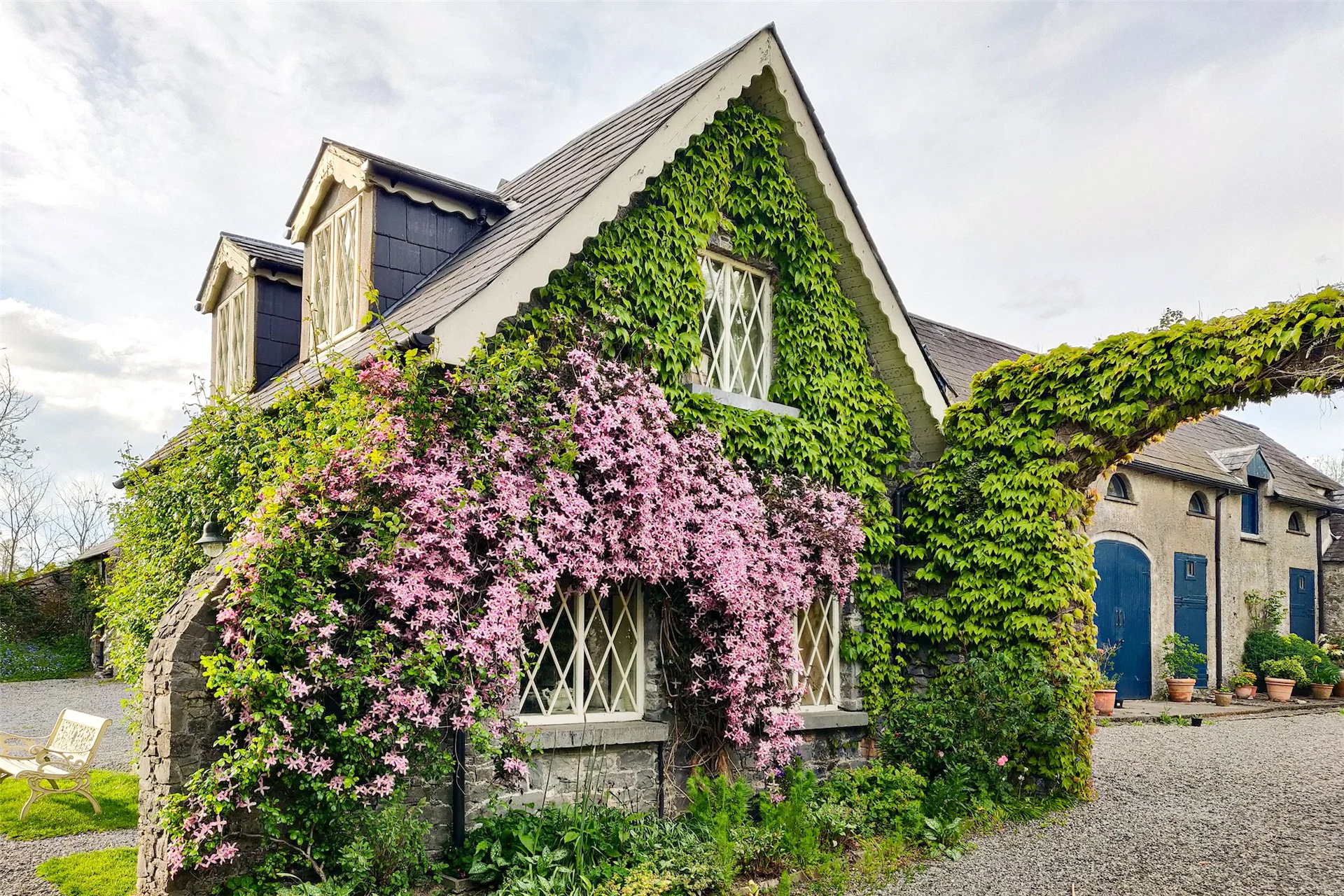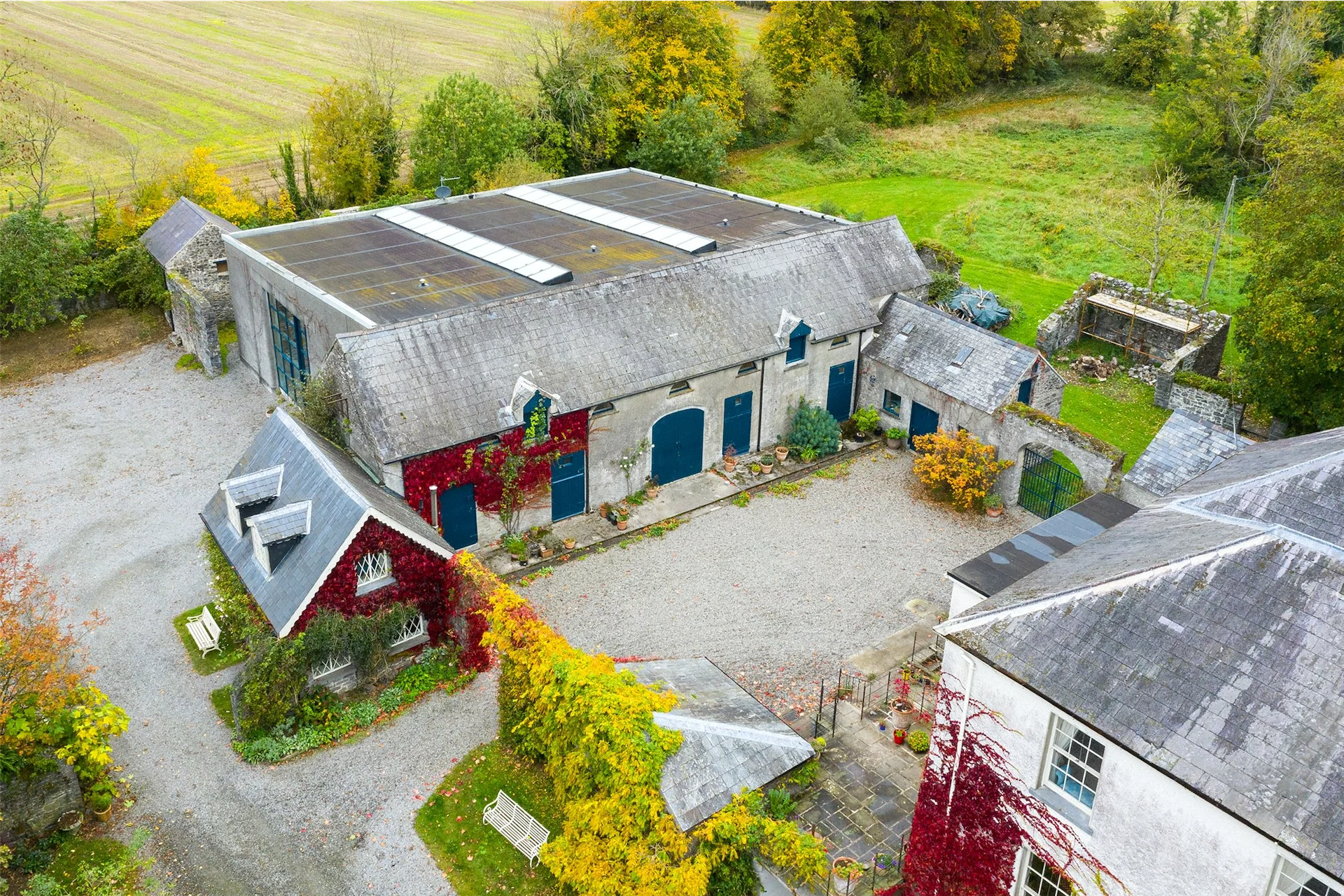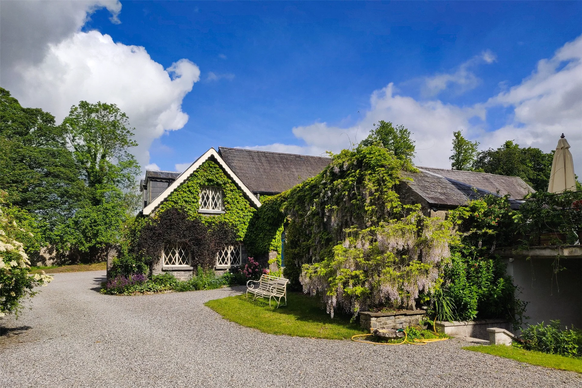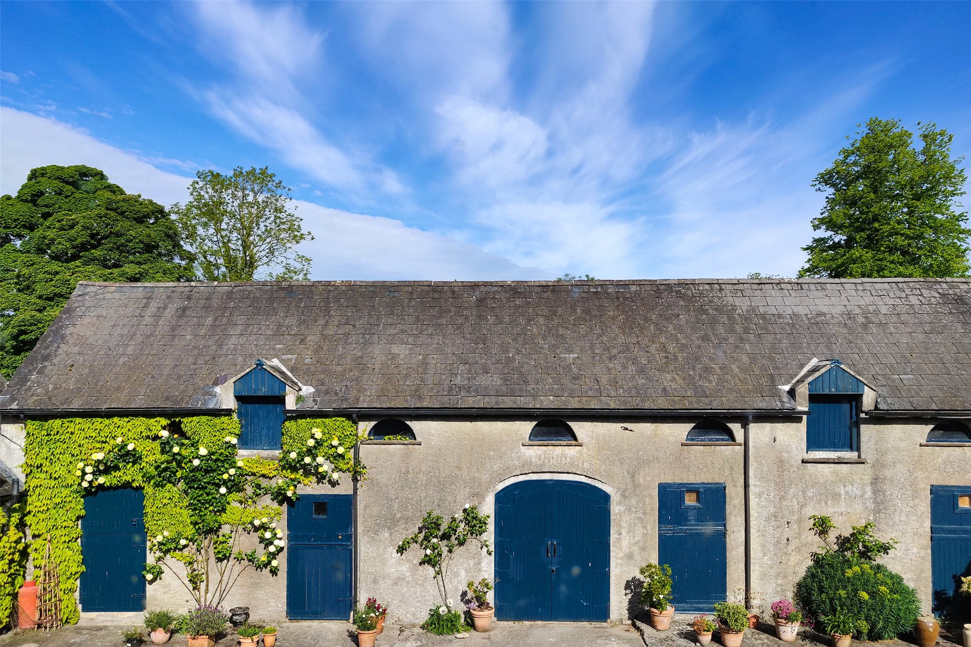 The grounds have been well-maintained, and many of the buildings are adorned with beautiful climbing plants including wisteria, roses and clematis. There is a stable yard with several outbuildings, while the walled garden also features some beautiful planting, and is a sheltered place to sit.