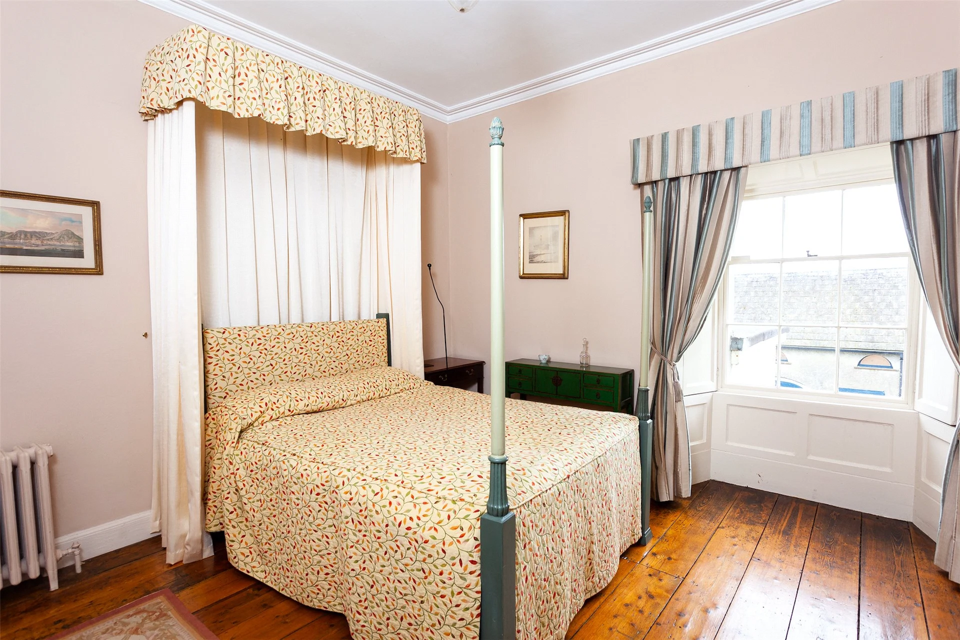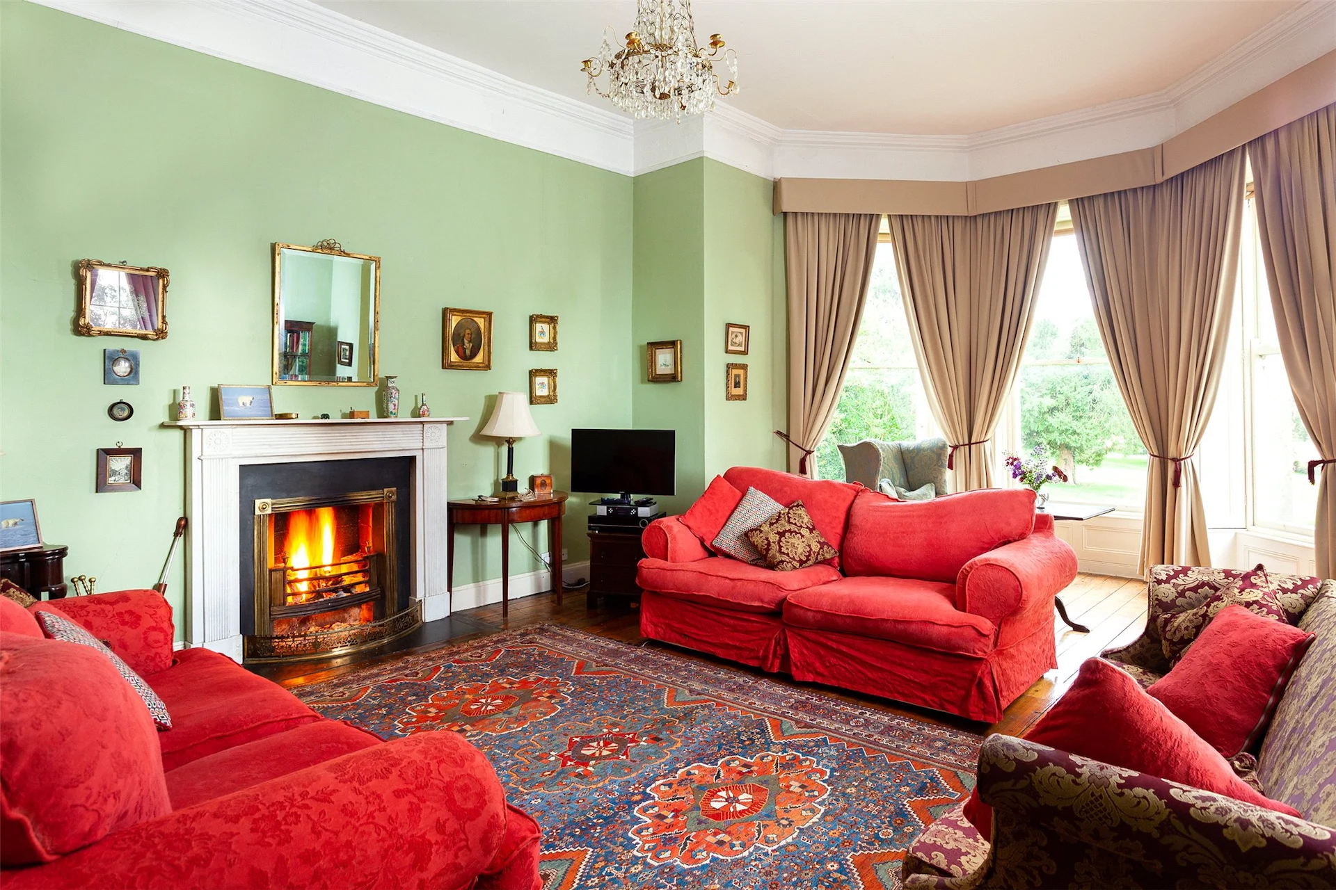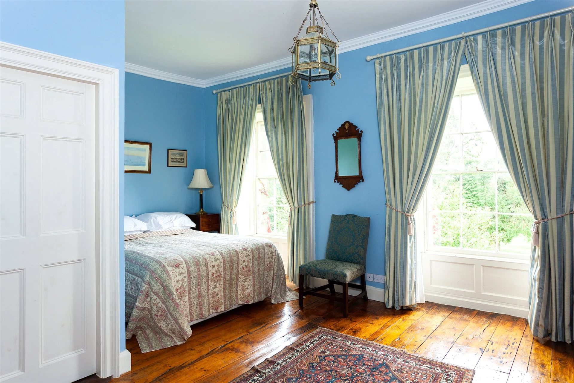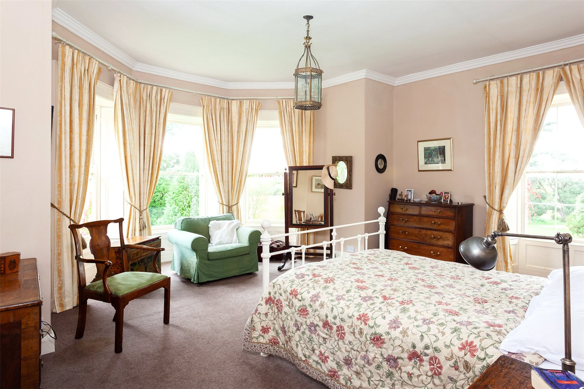 Upstairs are the five bedrooms, with two en suite, and a family bathroom. The main bedroom also features large bay windows that look out over the grounds.