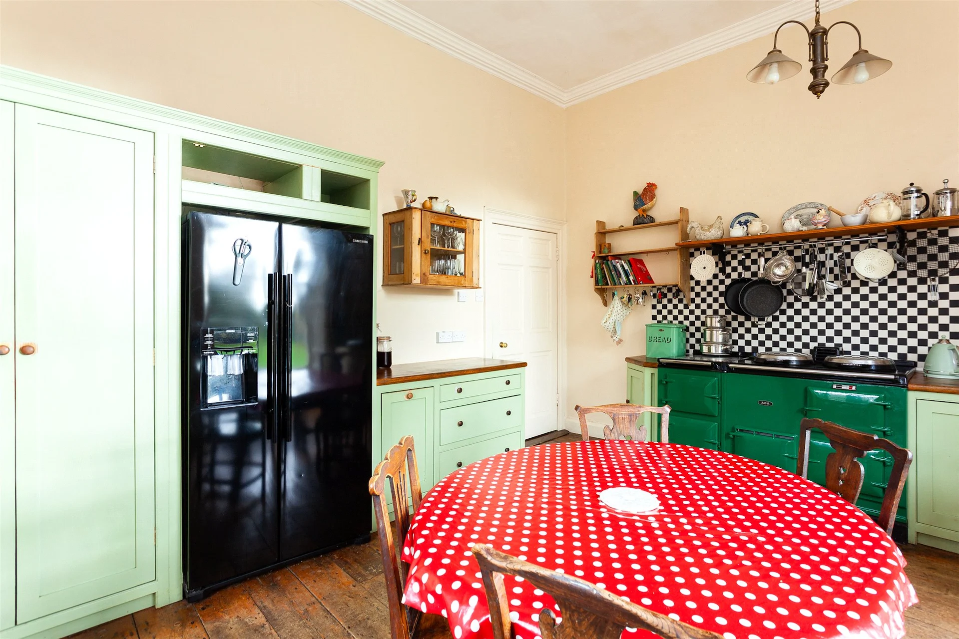 The drawing room has a large bay window and an open fireplace, while the dining room has original shutters and wooden floors. To the other side of the house is the kitchen, which has a traditional charm with its Aga and wooden floor. The exceptionally high ceilings mean that it is a bright space, and glass doors leading to an outdoor patio only enhance this.