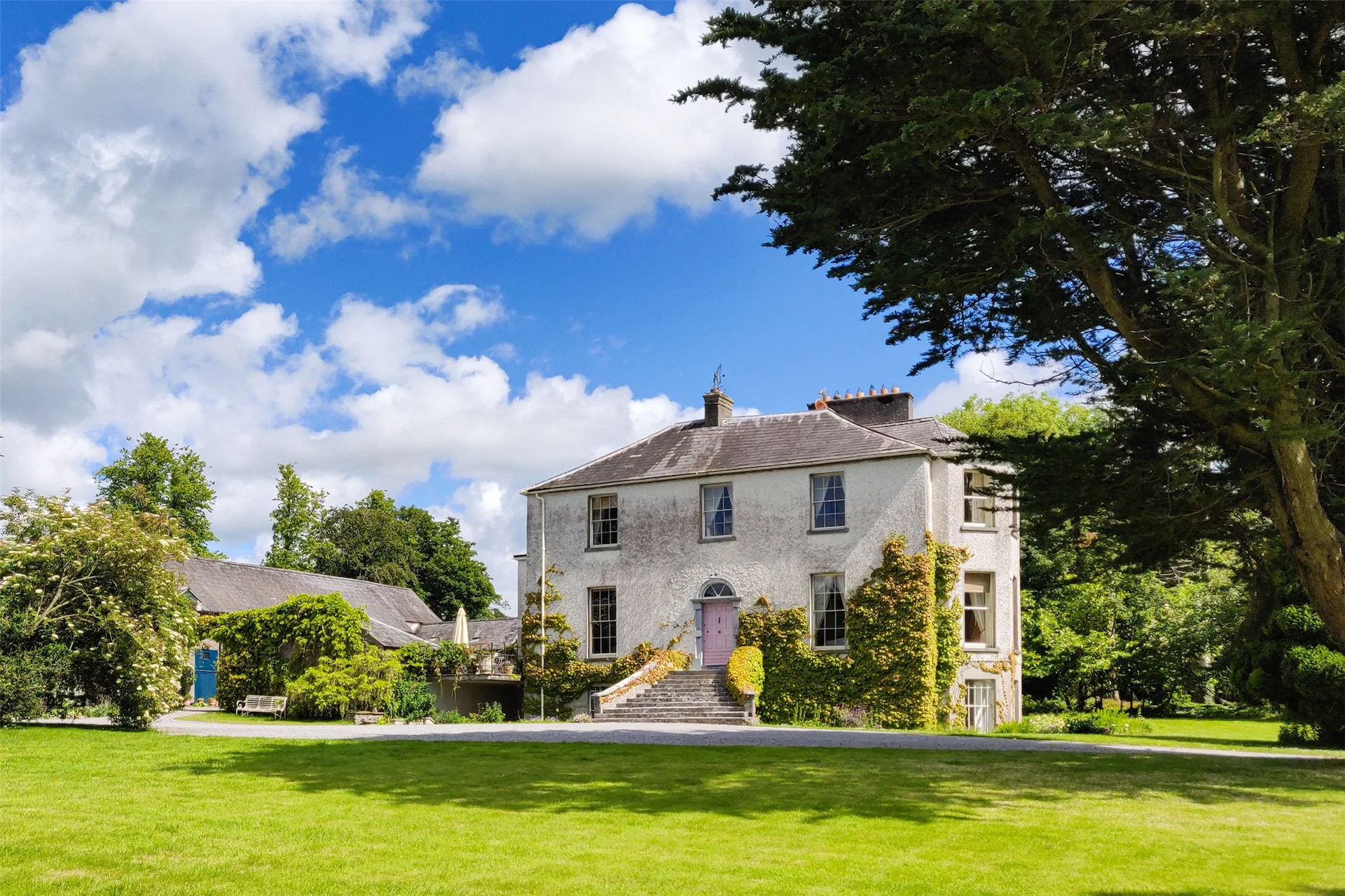 A home that has been used as a film location, and was previously the home of artist Hughie O’Donoghue, Kilfane Glebe is full of character. It comprises a large five-bedroom Georgian house which still has many of its period features, in addition to a one-bedroom cottage, stable yard, large contemporary studio and 8.8 acres of landscaped grounds.