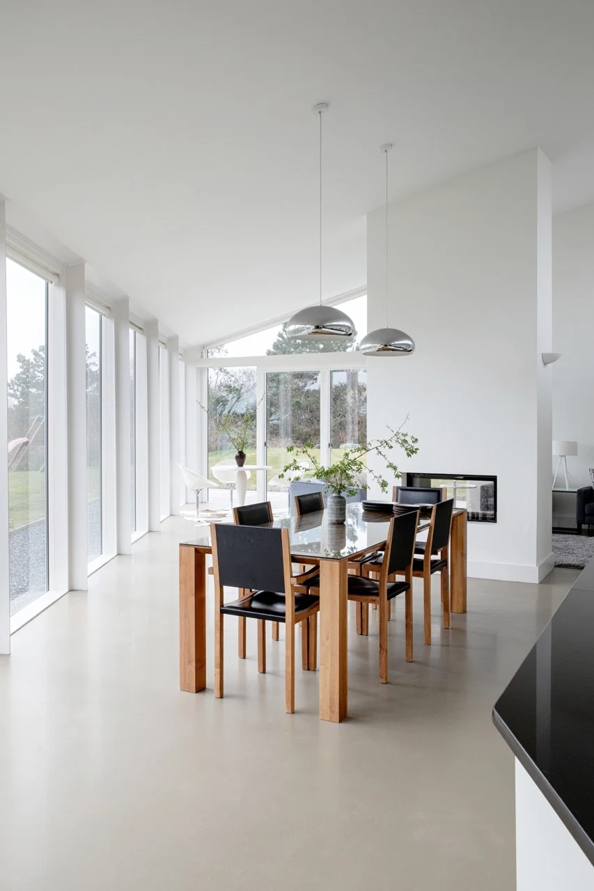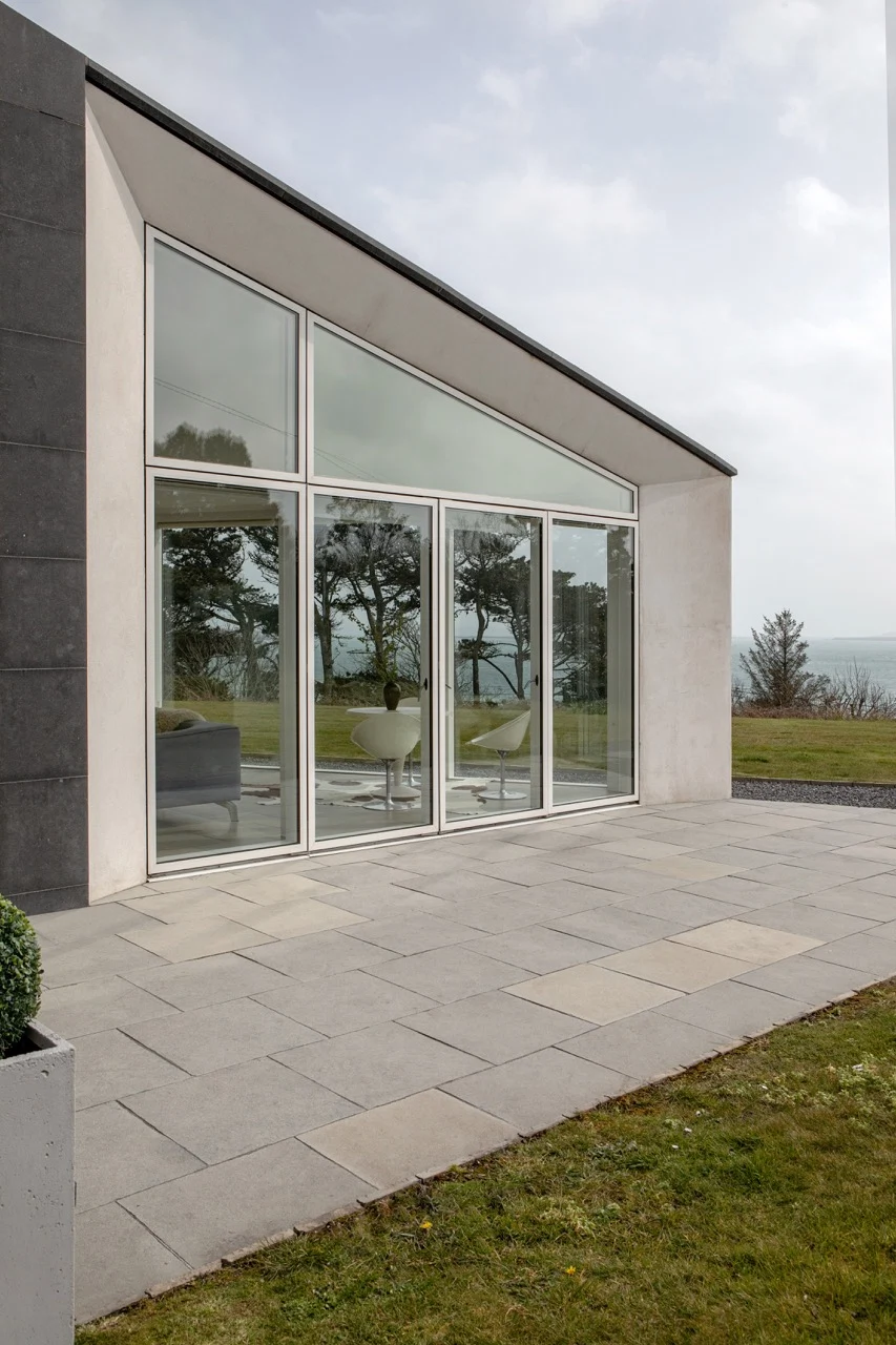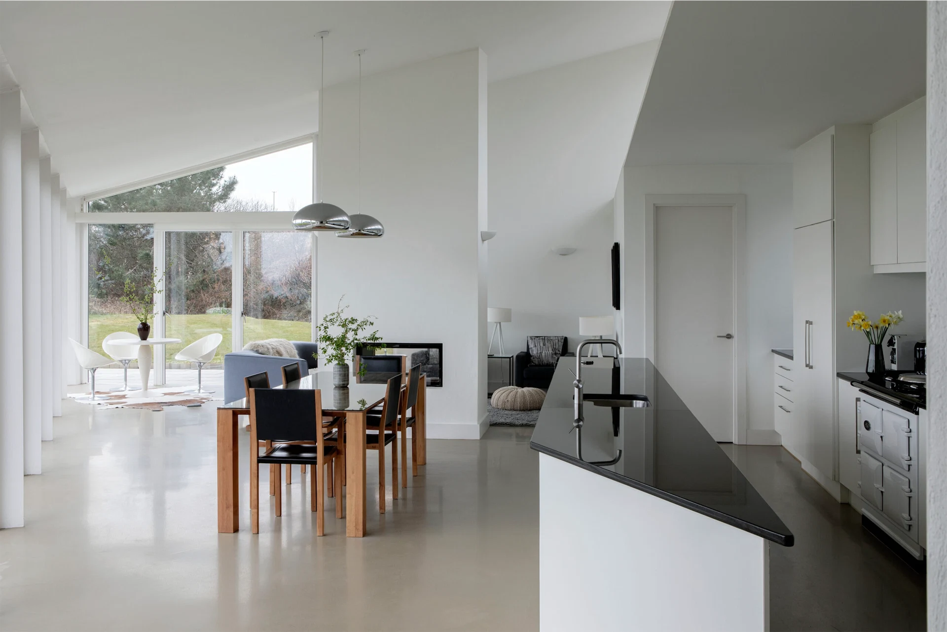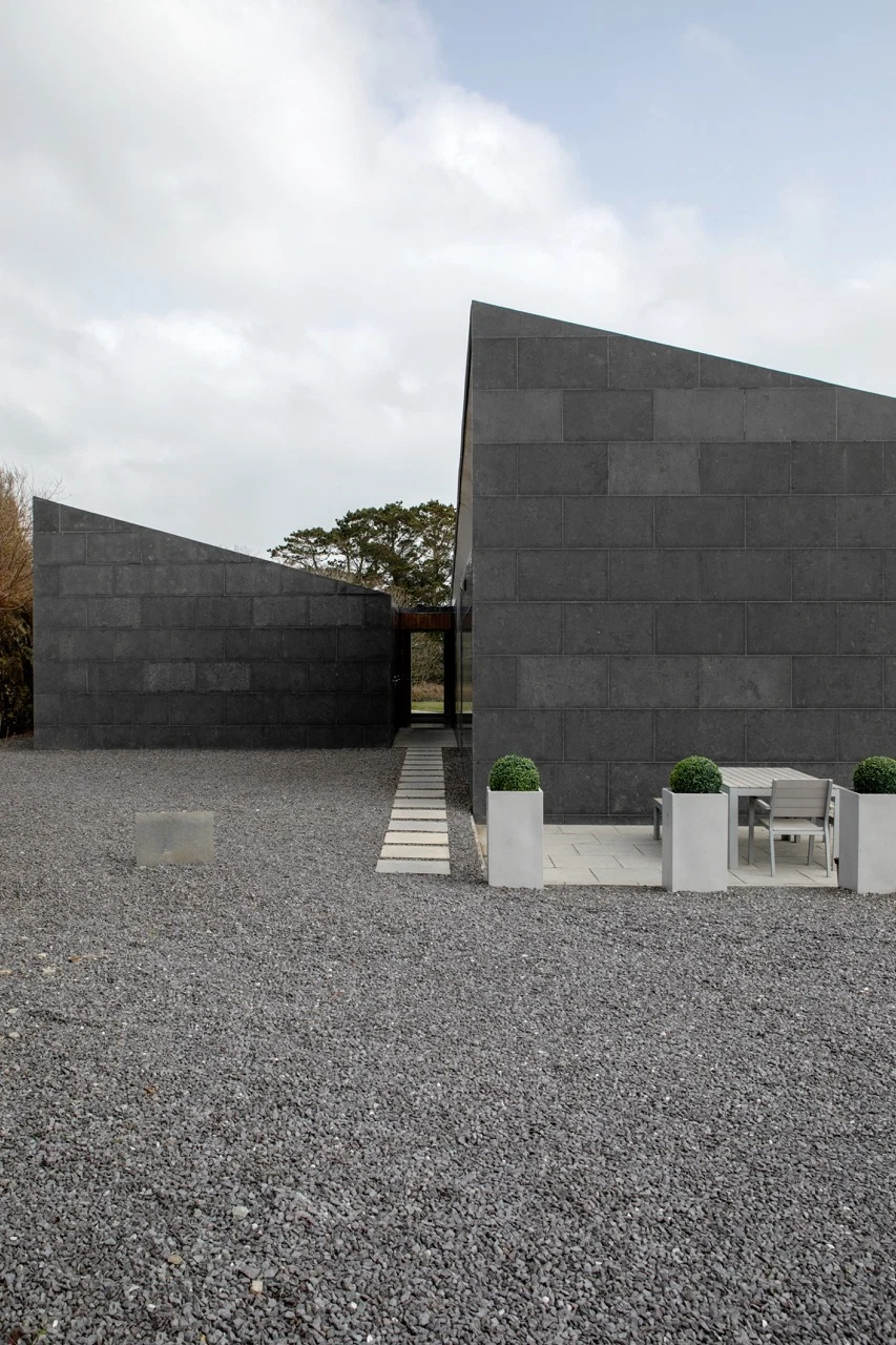 The material palette adds to the overall effect of this serene, pared back space. Clad in Kilkenny black limestone, inside resin on poured concrete floors creates a minimalist softness, while the large windows are set into white, adding lightness.