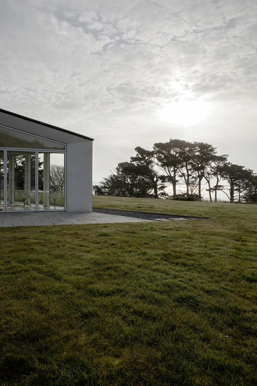Owner Lyons O’Keeffe explains that this site has a particular significance. “The house is located beside my childhood home on wild scrub land on which I used to play. That wildness is intentionally kept as you proceed along the avenue, up the rough driveway to the top where wildness temporarily gives way to very sharp and clean lines of the building and surrounding lawns and patio.”