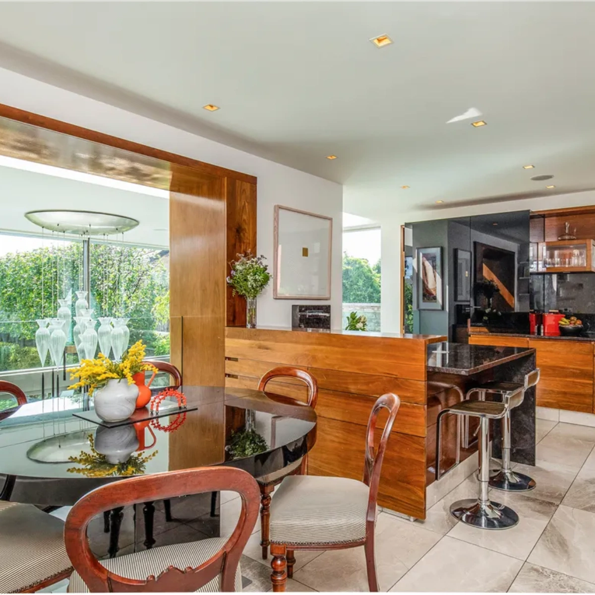 Steps lead down to the bright and airy dining room below where light floods in by way of double-height windows. Specially constructed large format sliding panes open onto the garden and terrace, making it the perfect space for al fresco dining.