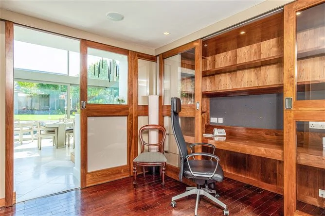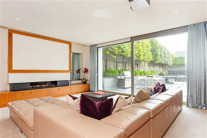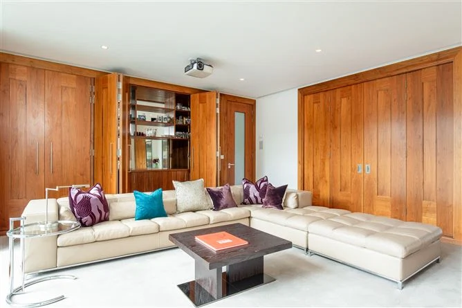 The main family room/cinema room can be found under the formal drawing room and has been fitted with a hidden bar, projector and screen. One of the five bedrooms, currently being used as a home gym, can be found to the front while a full bathroom with sauna is located beside this room.