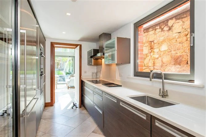 An elegant two-storey over basement property, 7 Ailesbury Road was beautifully refurbished and dramatically extended by current owners with thanks to a design from AOF Architects and input from Dublin City Council’s conservation office. Configured to work as both a family space and an area in which to entertain guests, many of the original period features were restored – including cornicing, coving, ceiling roses and original fireplaces – complemented by more modern additions ranging from a dining room extension to a sheltered courtyard and luxurious natural swimming pool.