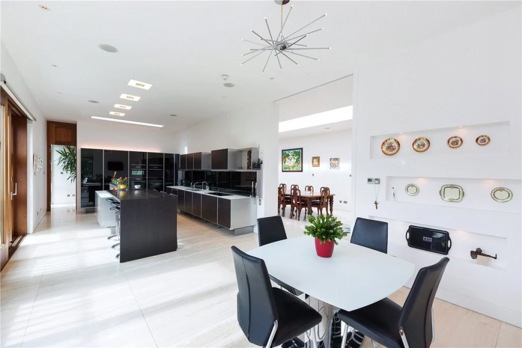 A long kitchen and breakfast room are bright and airy, with large windows. The black polished glass fronted units and white quartz worktops add to the clean feeling of this space.