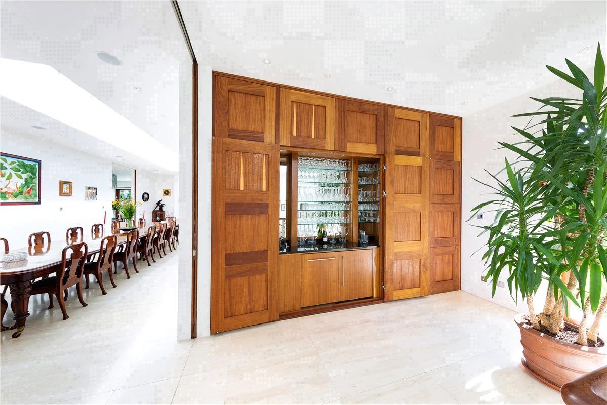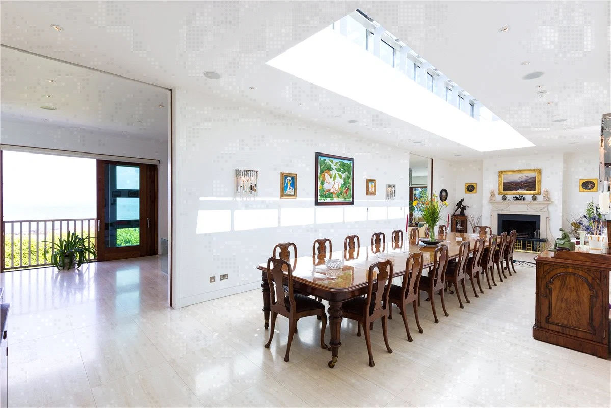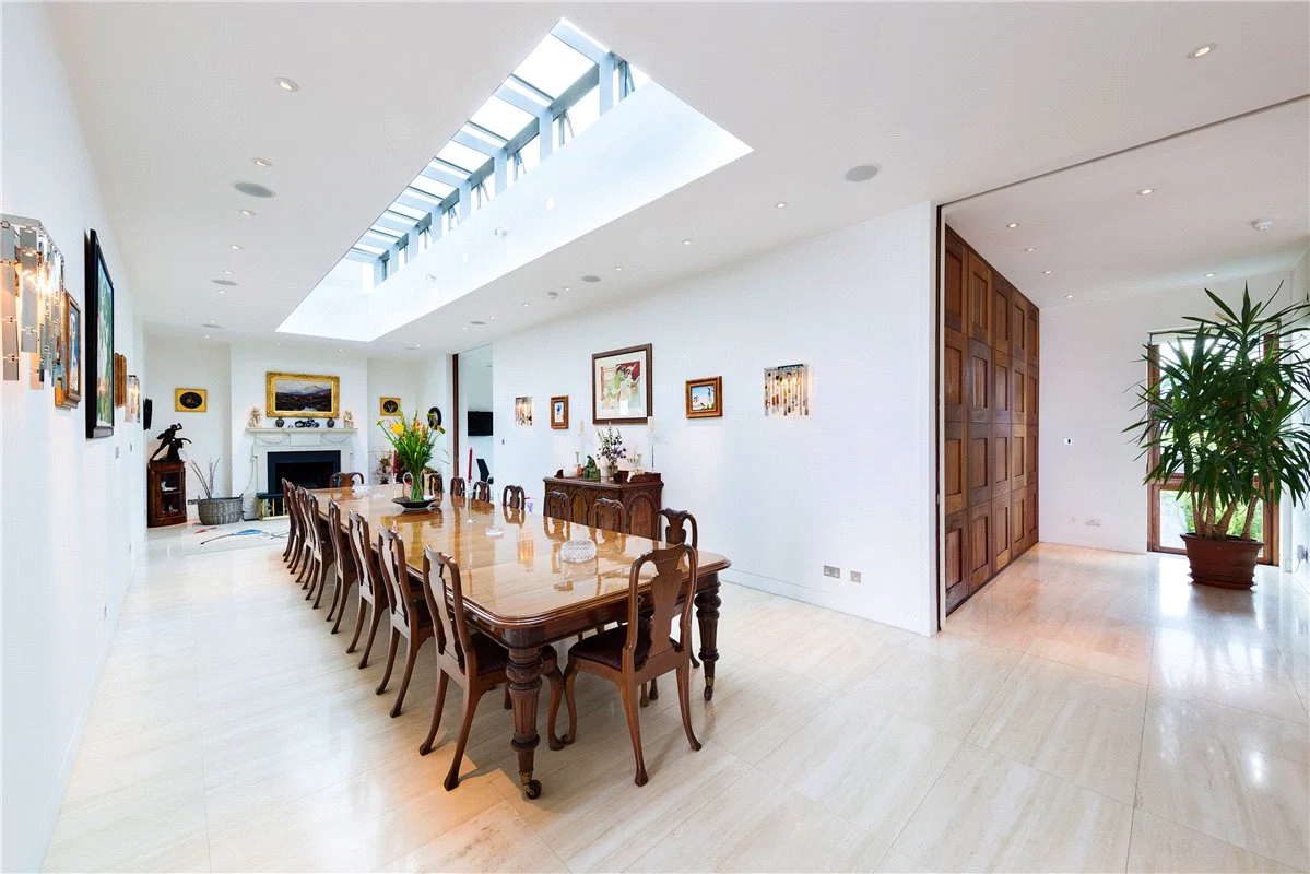 As well as the staircase, there is also a lift in the home. At the heart of the first floor is a dining room with an atrium ceiling which has space to seat a crowd. There is also an antique fireplace and a built-in bar area.
