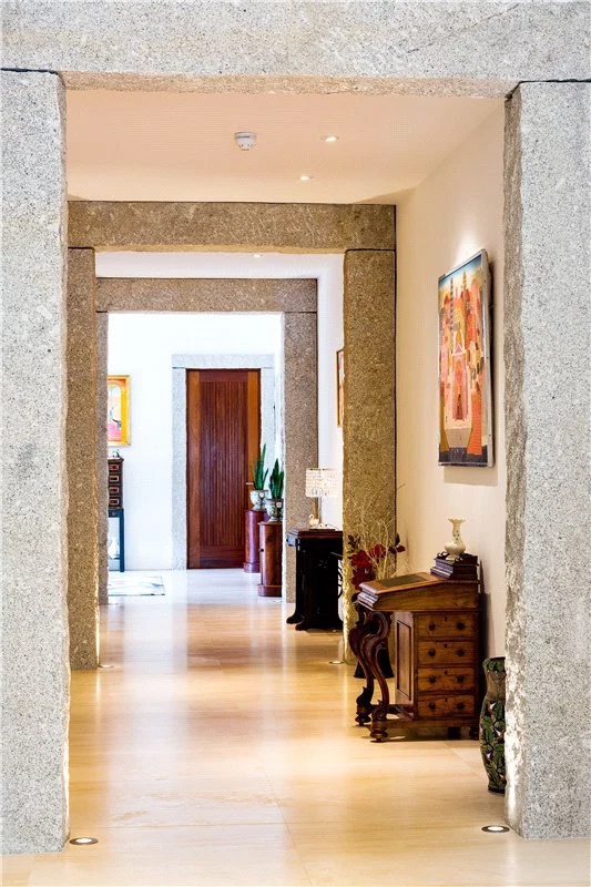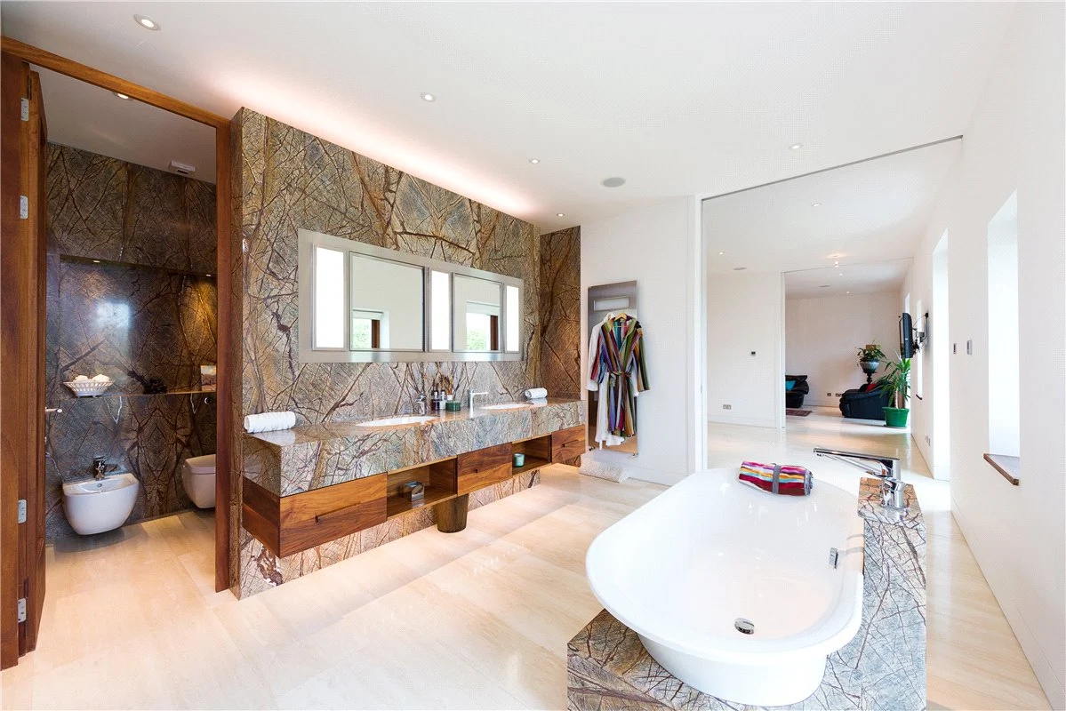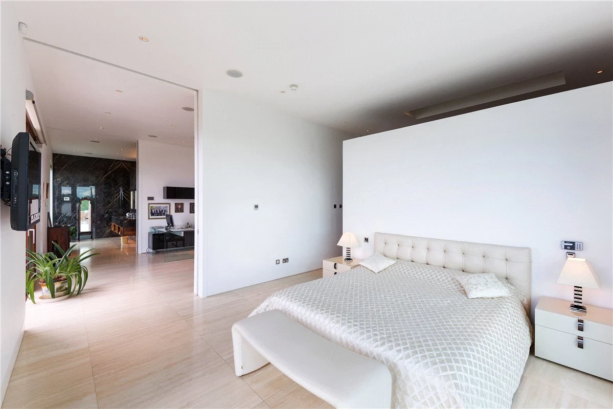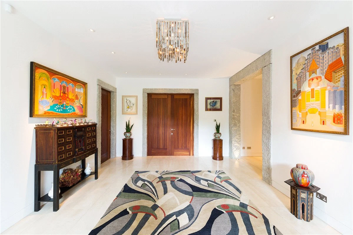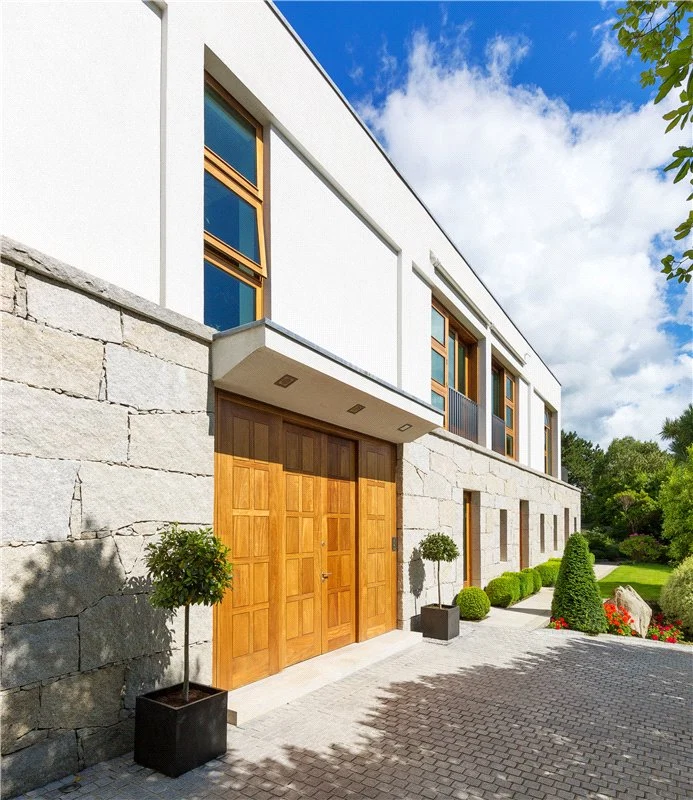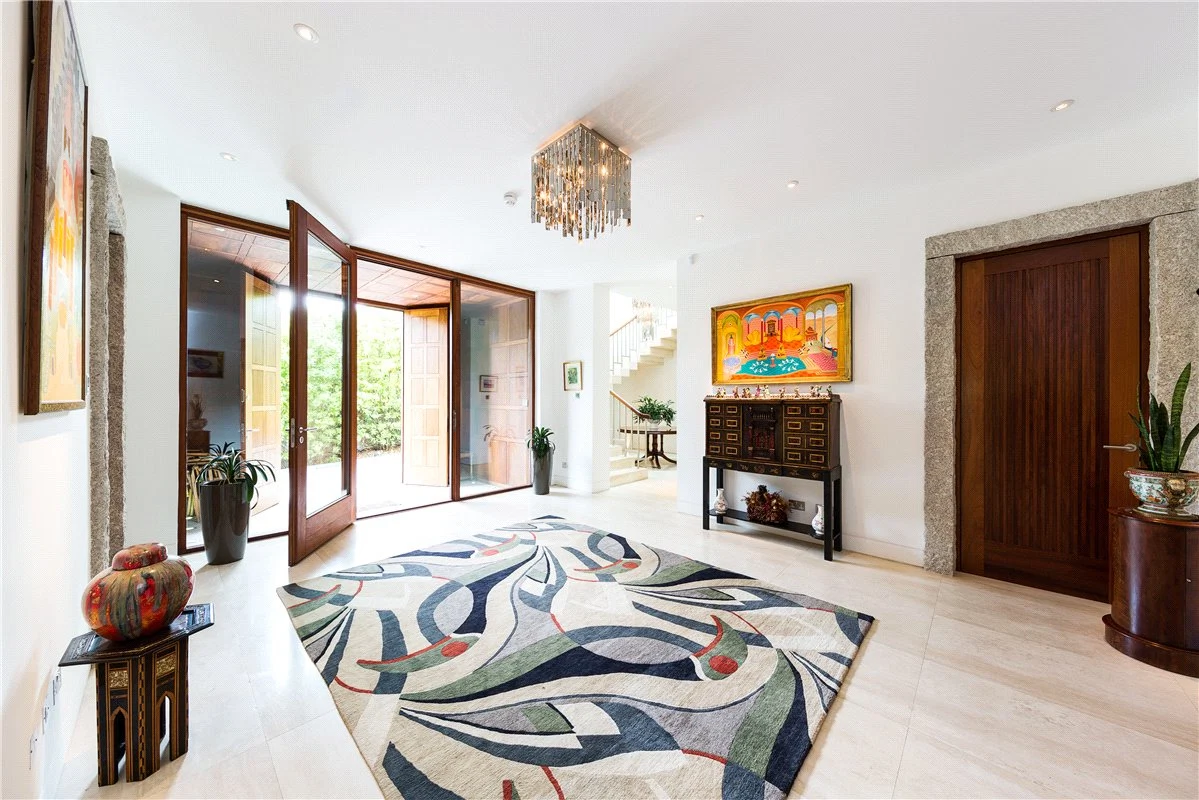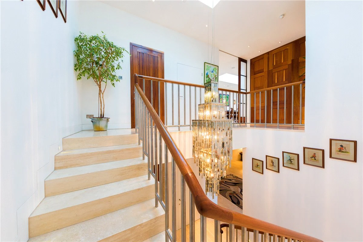 The home has two entrances, with each driveway enjoying a dramatic view. You enter the home into a large entrance hall, which features a custom-made Navona Travertine floating staircase, dramatic granite pillars and solid Iroko doors.
