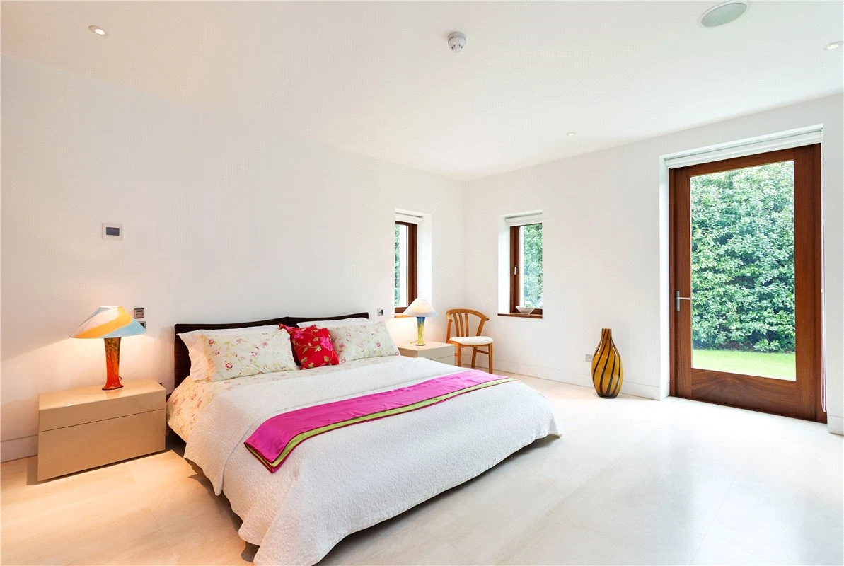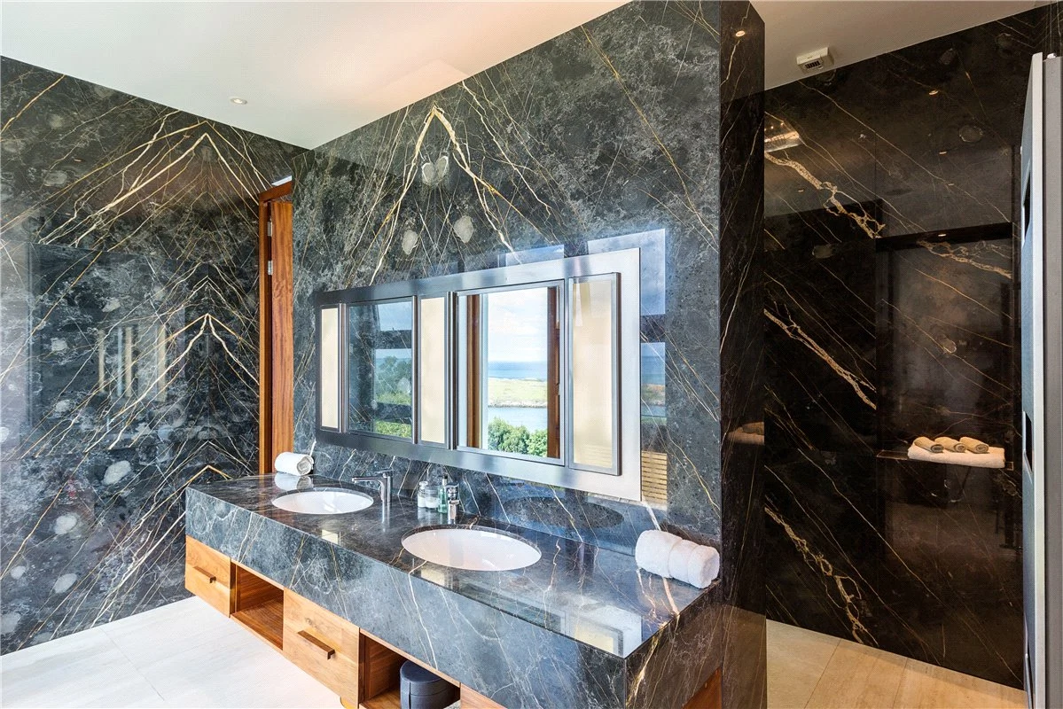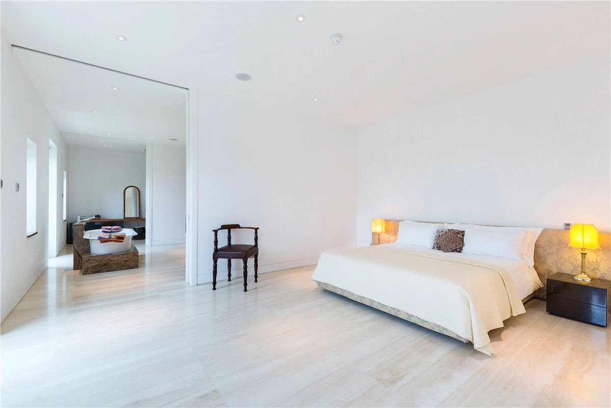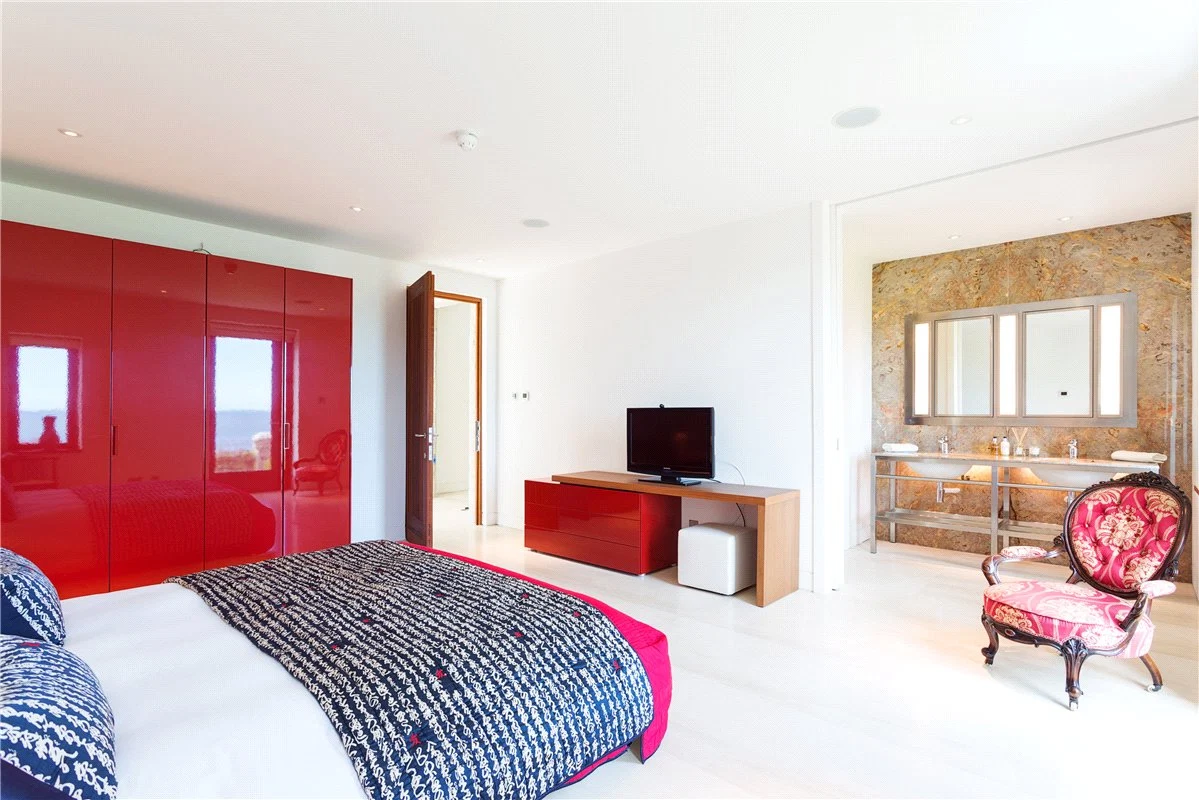 Four of the bedrooms are located on the ground floor, to prioritise the elevated views for the reception rooms on the first floor. These each have an en suite bathroom, while a guest suite has both a bathroom, dressing room and living space.