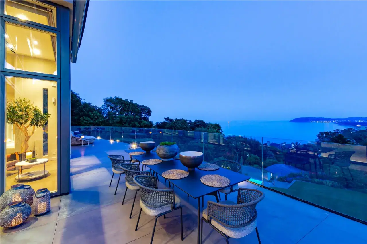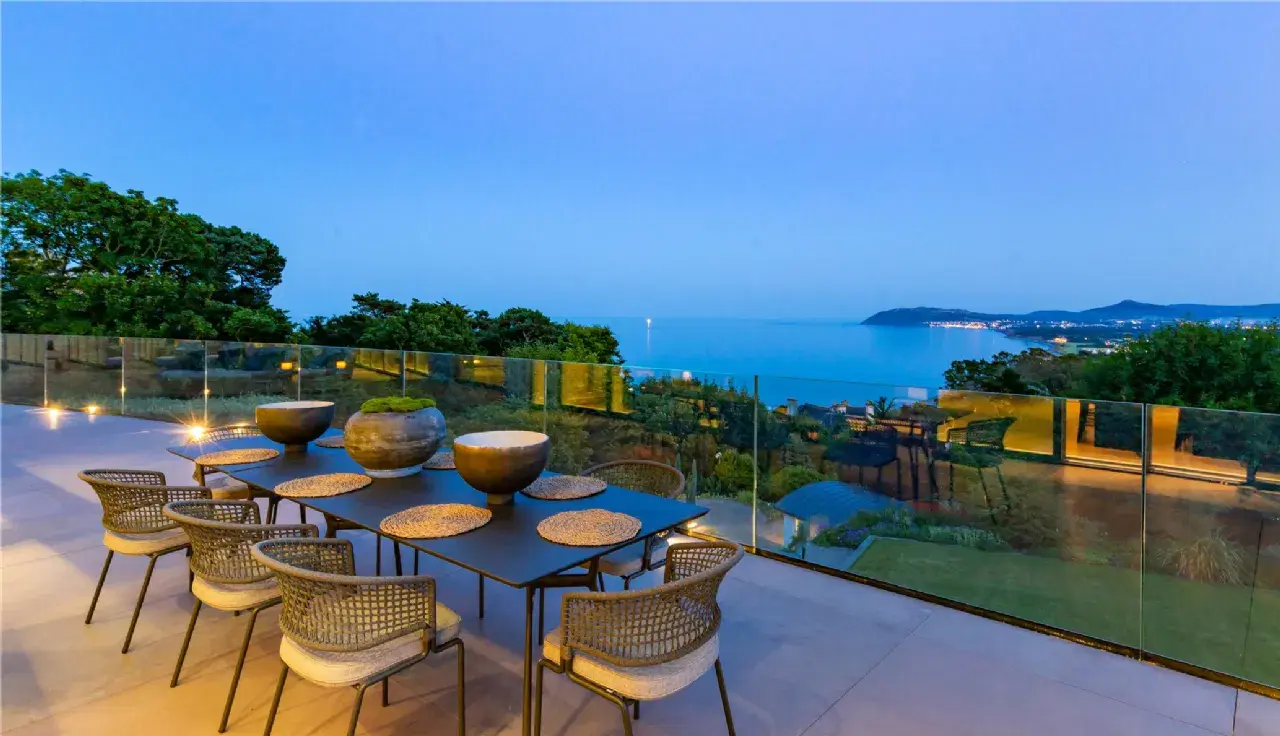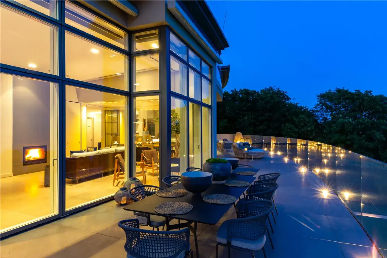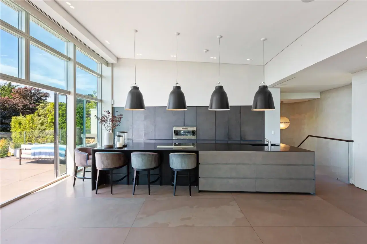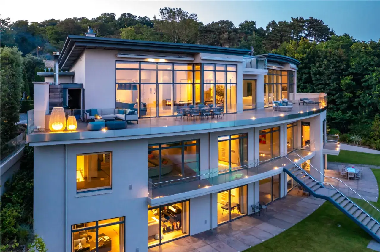 A masterpiece of light, space and views, the main building features three levels of glass-fronted accommodation and terraces, creating a living experience that marries modern design with cosy family living.