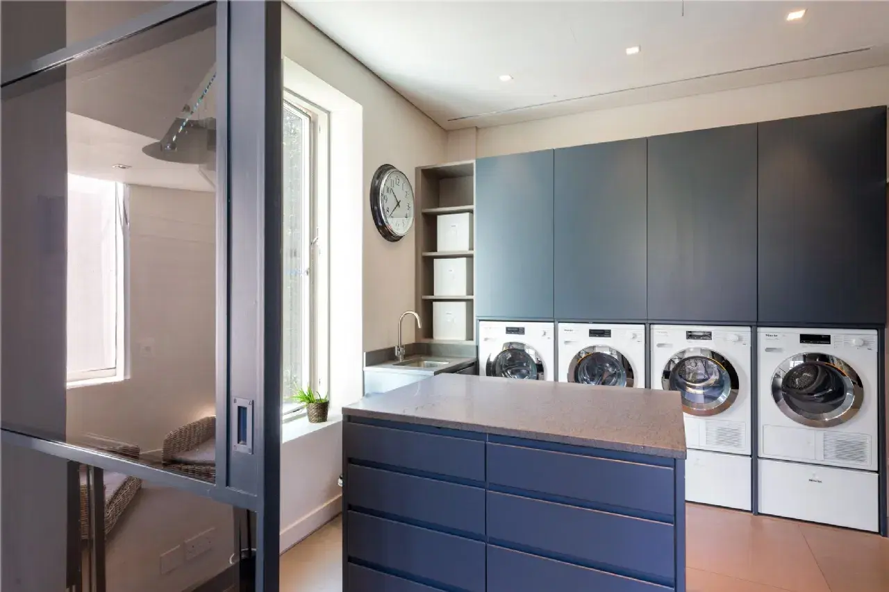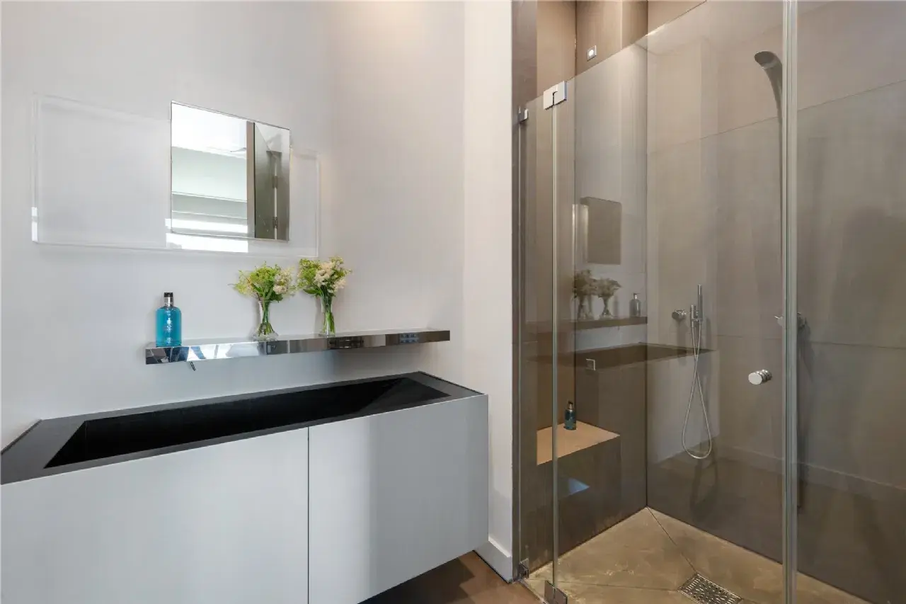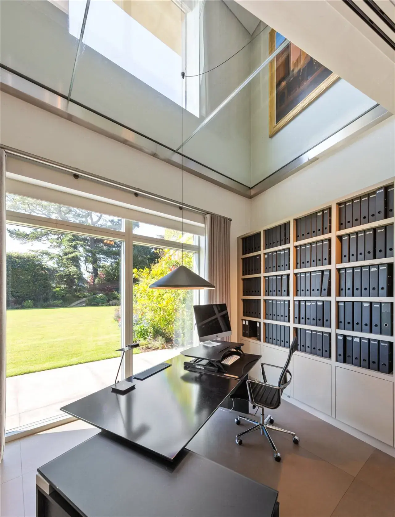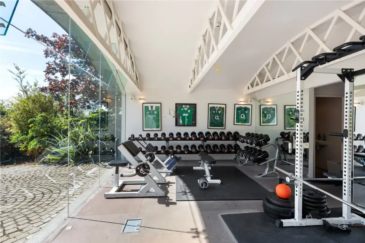 The deceptively spacious garage includes double entrance doors and an electronic lift parking system that can accommodate up to four cars. Elsewhere, an architecturally detached structure in the lower part of the garden merges the bright and airy gym area with refreshing shower facilities.