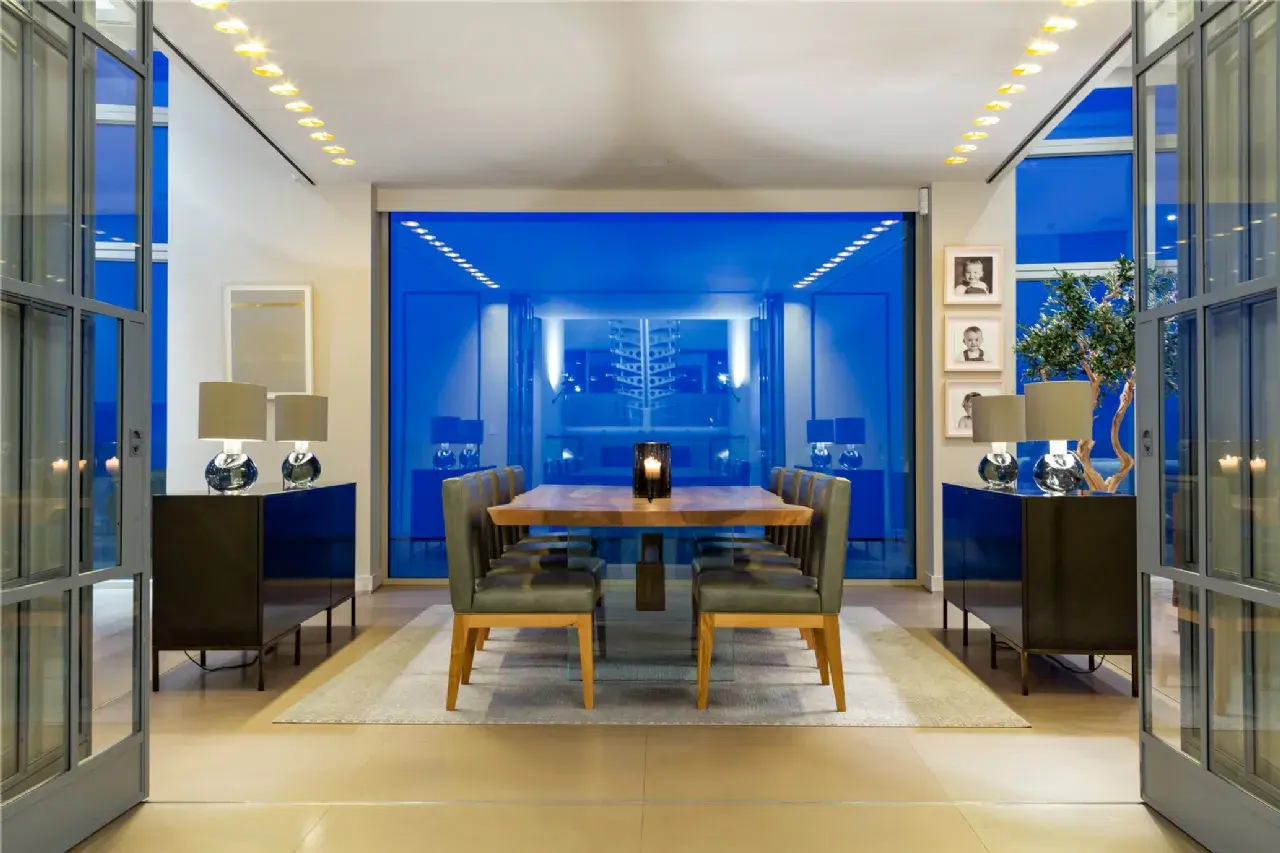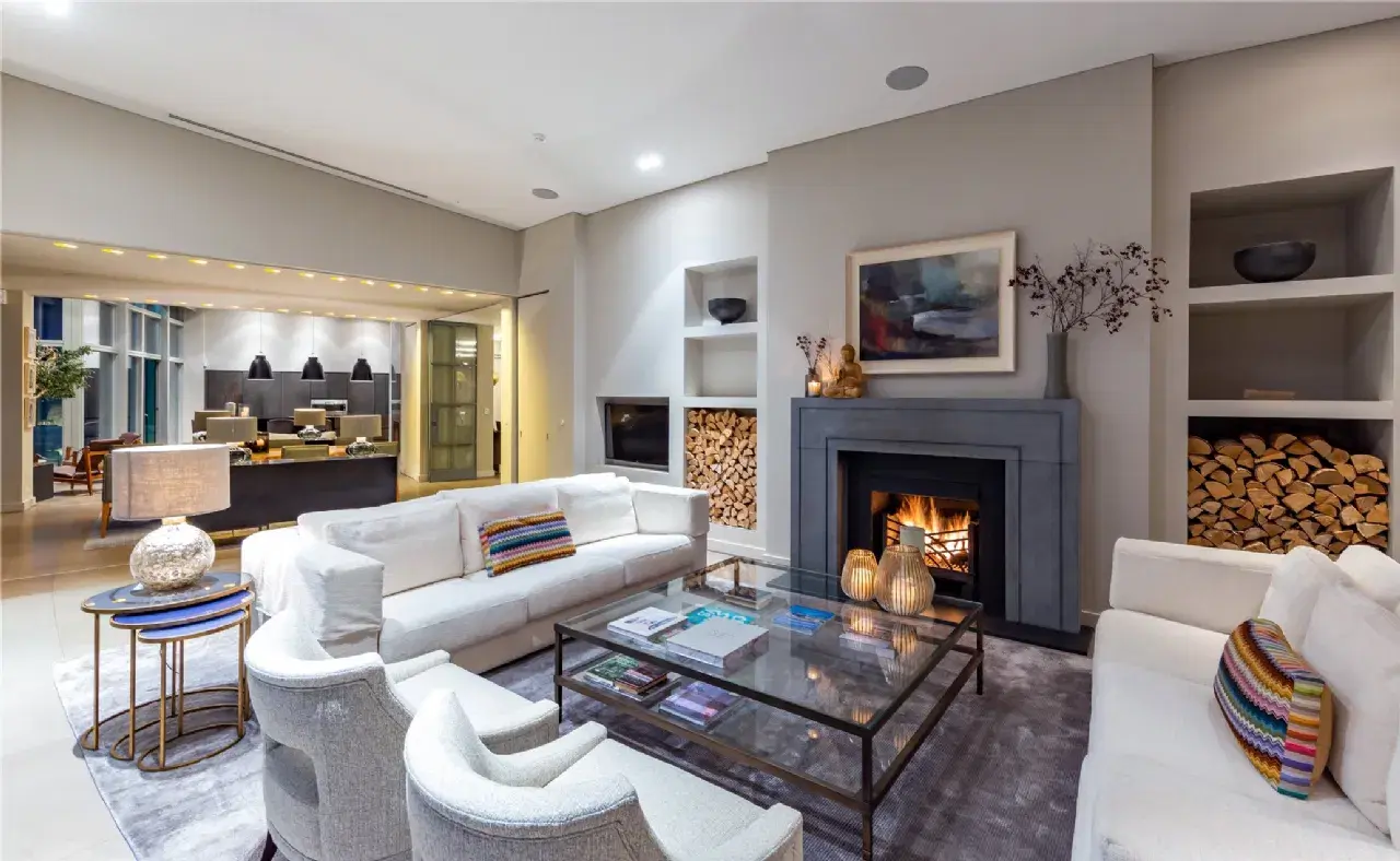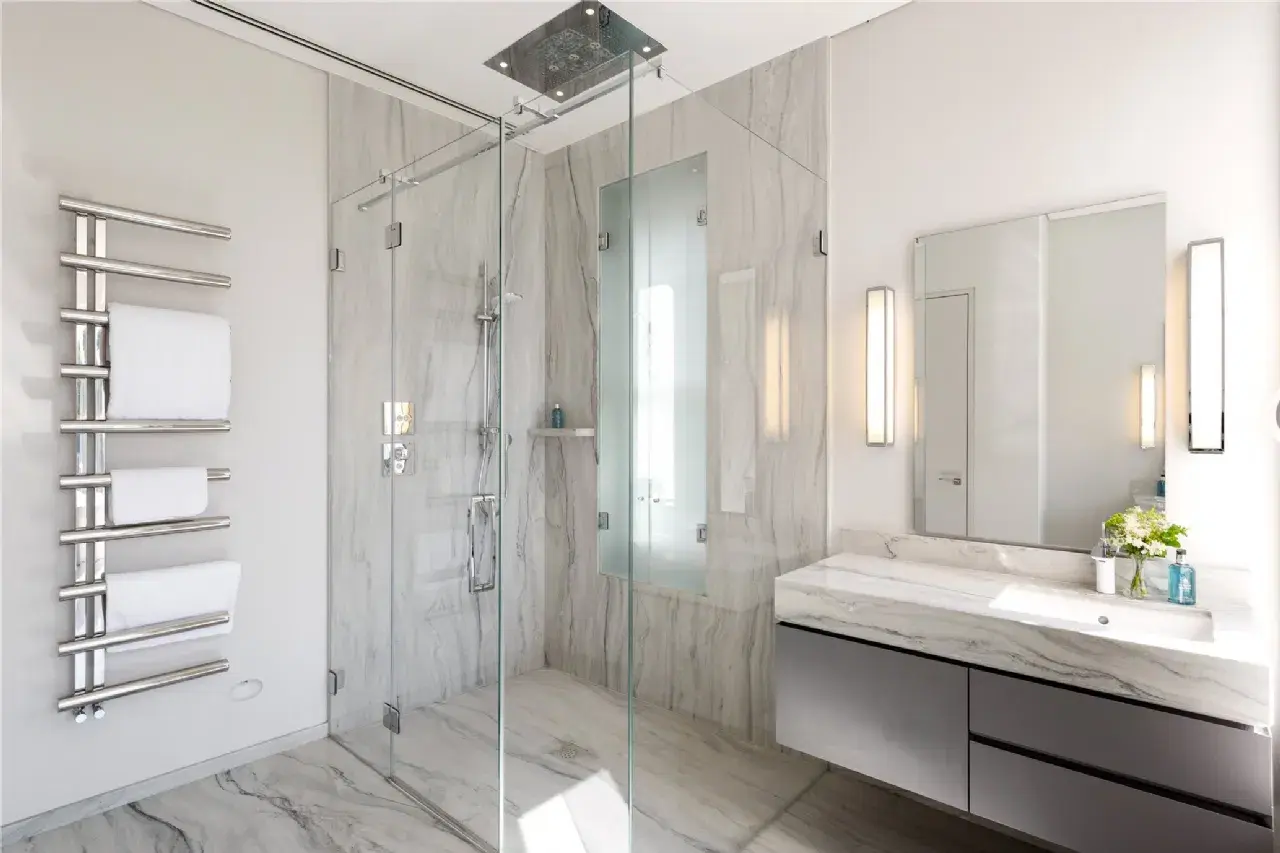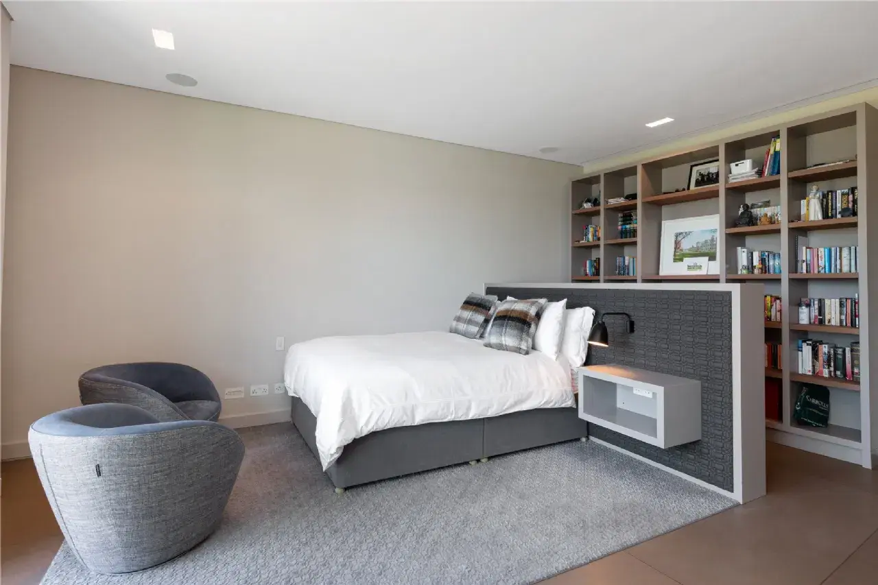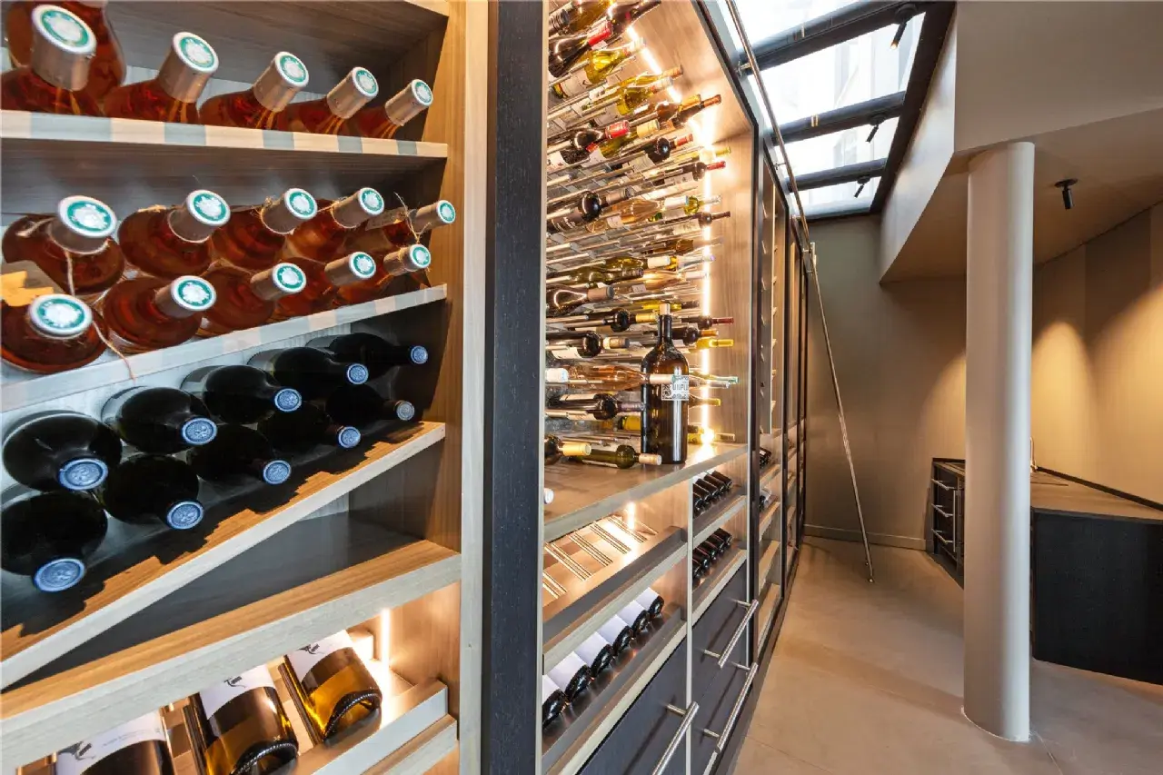 The deceptively spacious garage includes double entrance doors and an electronic lift parking system that can accommodate up to four cars. Elsewhere, an architecturally detached structure in the lower part of the garden merges the bright and airy gym area with refreshing shower facilities.