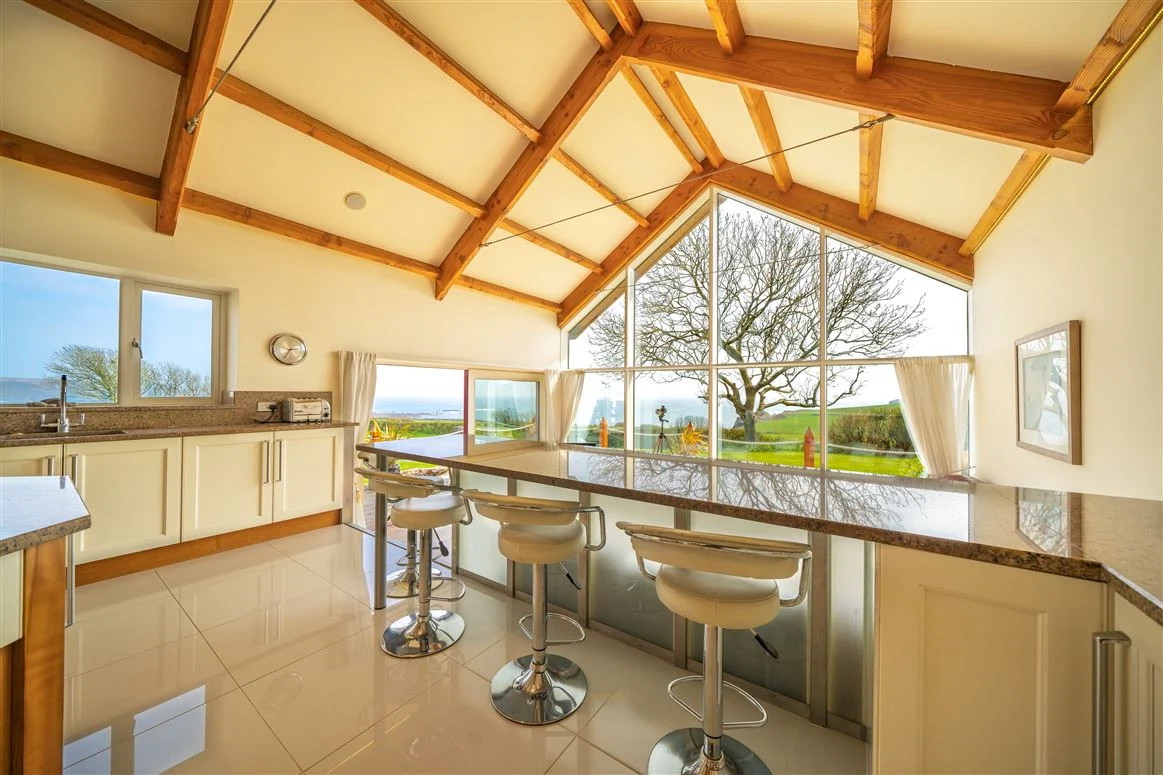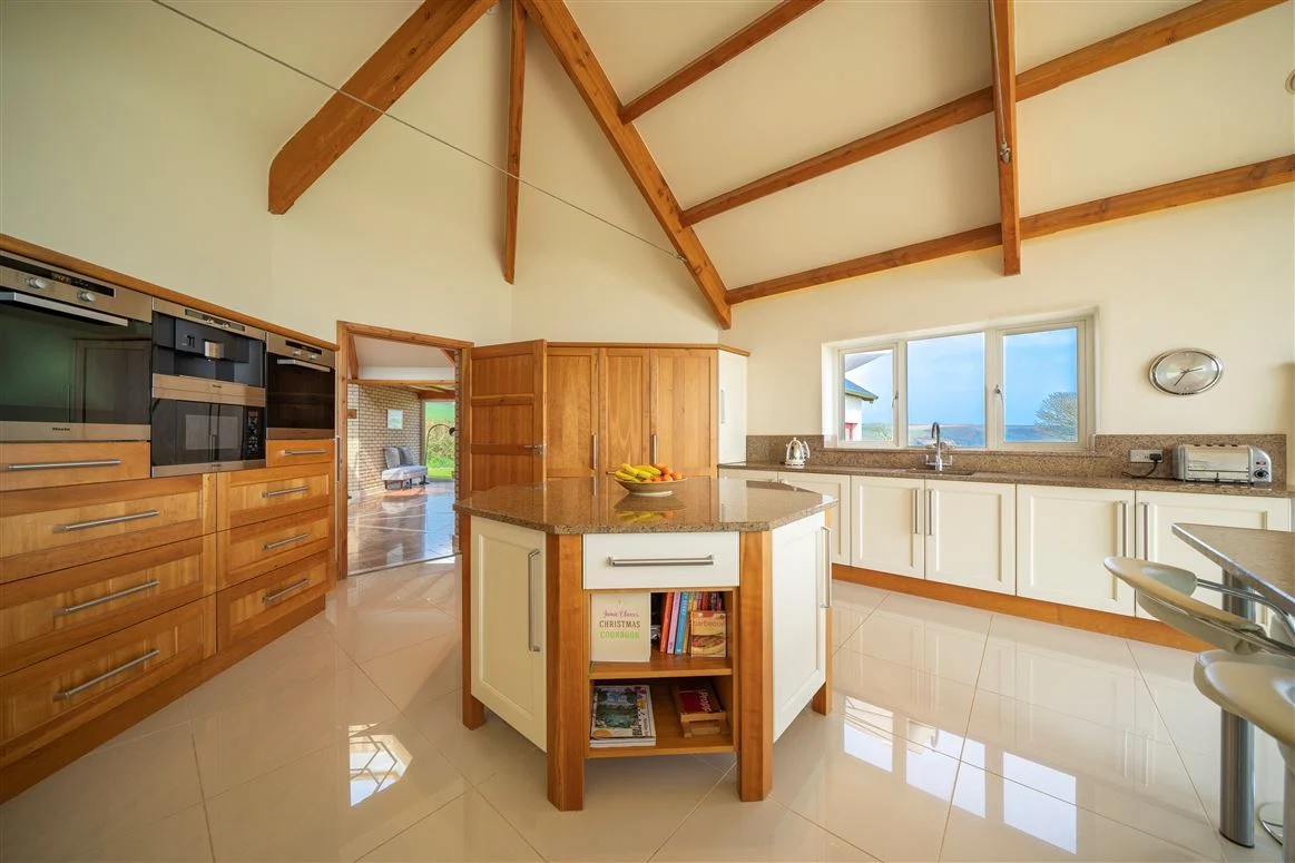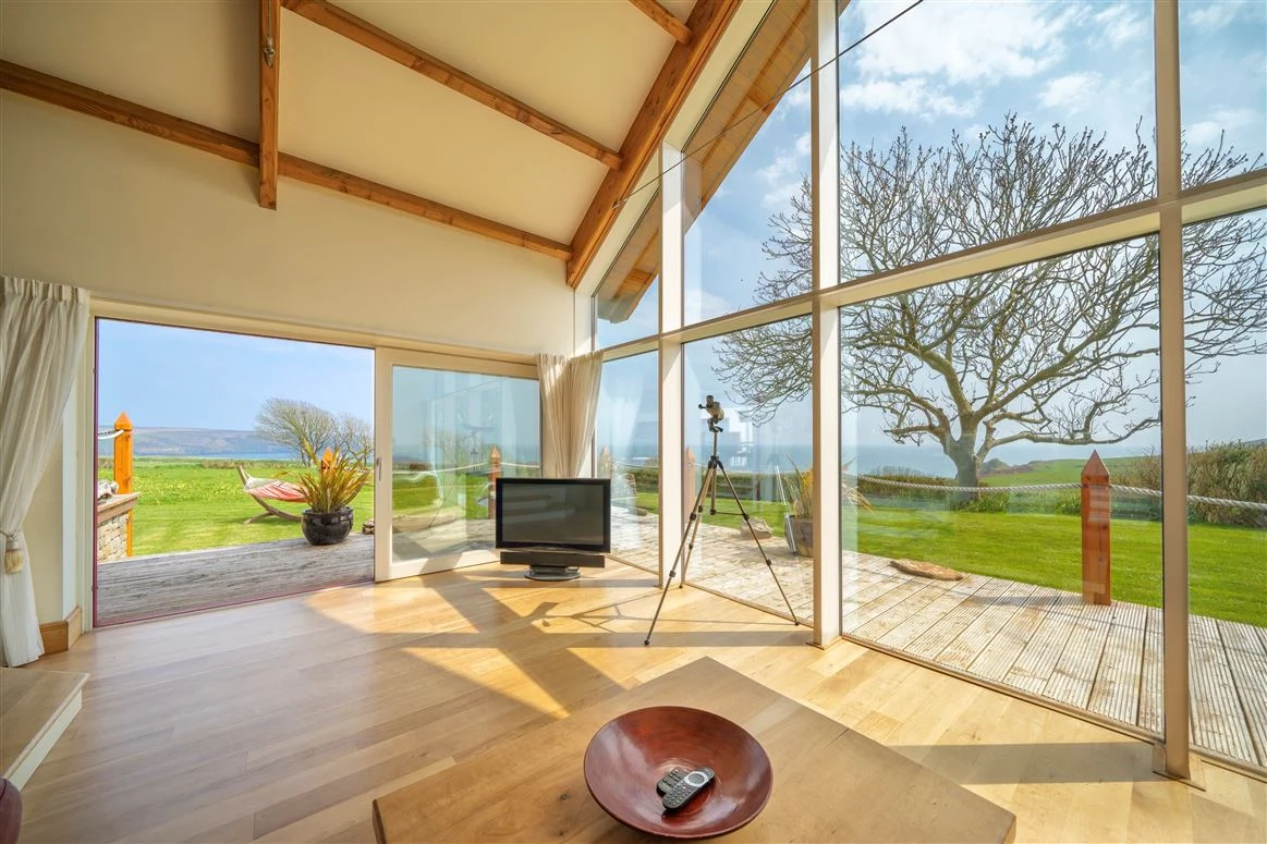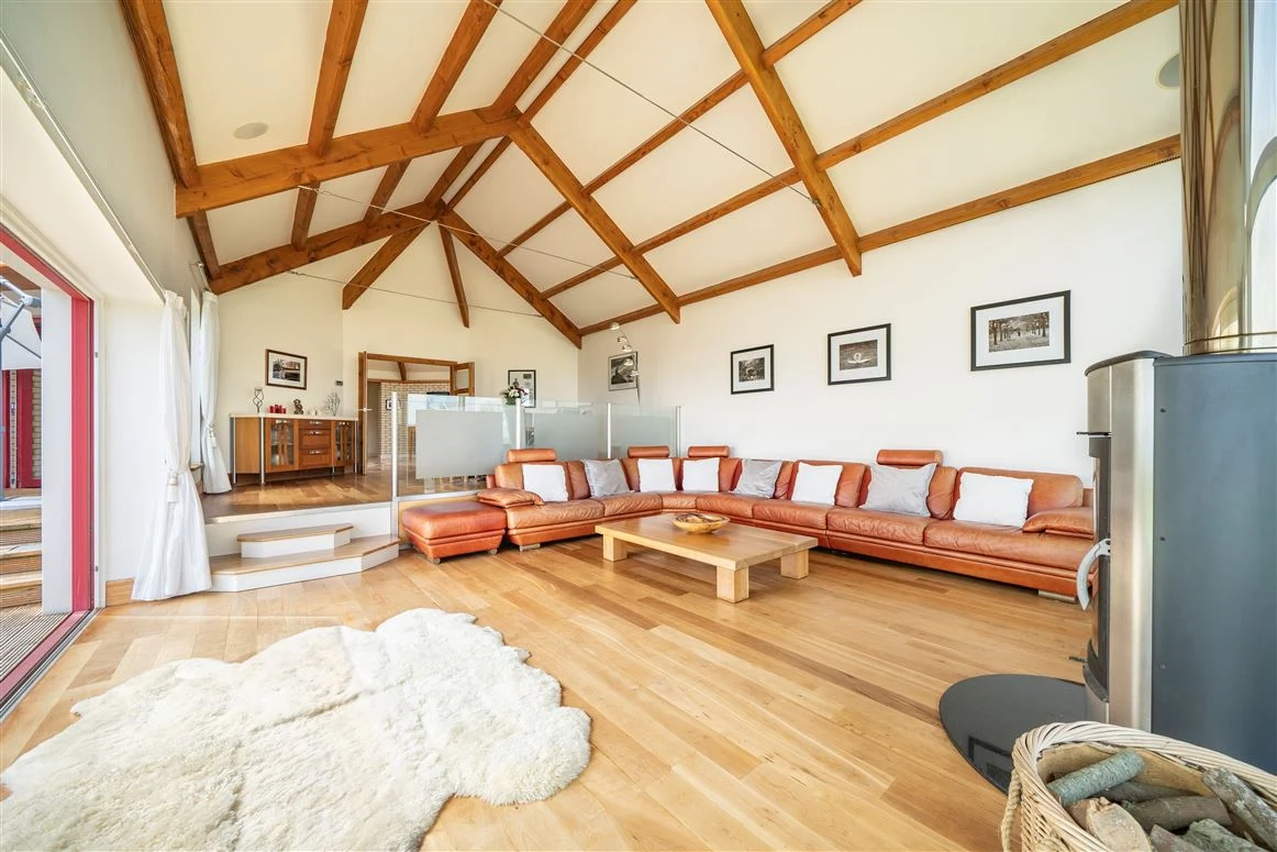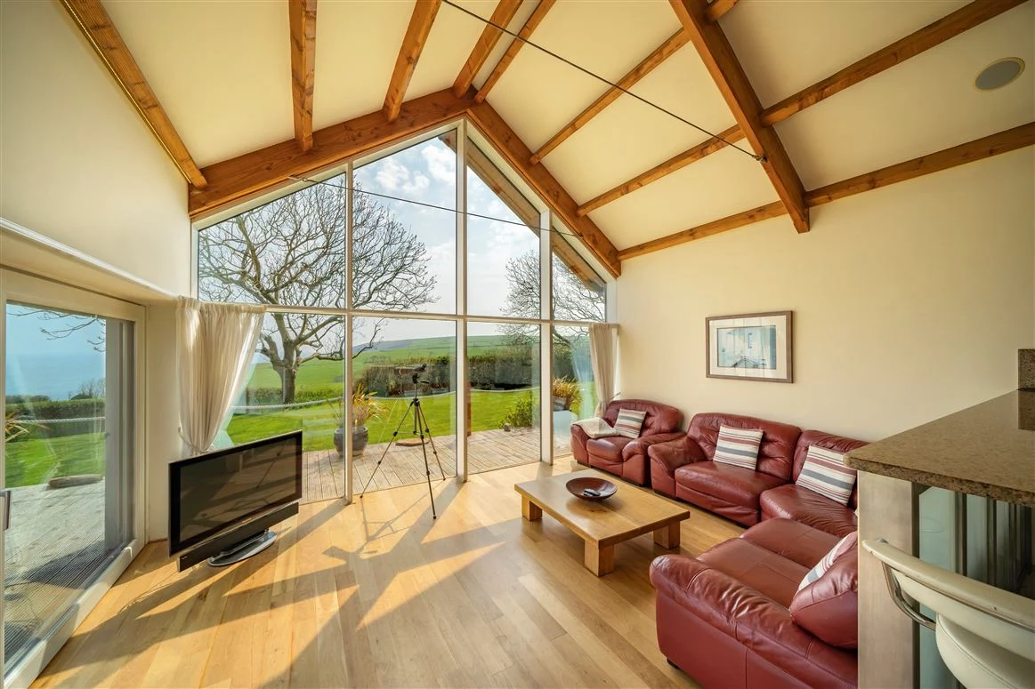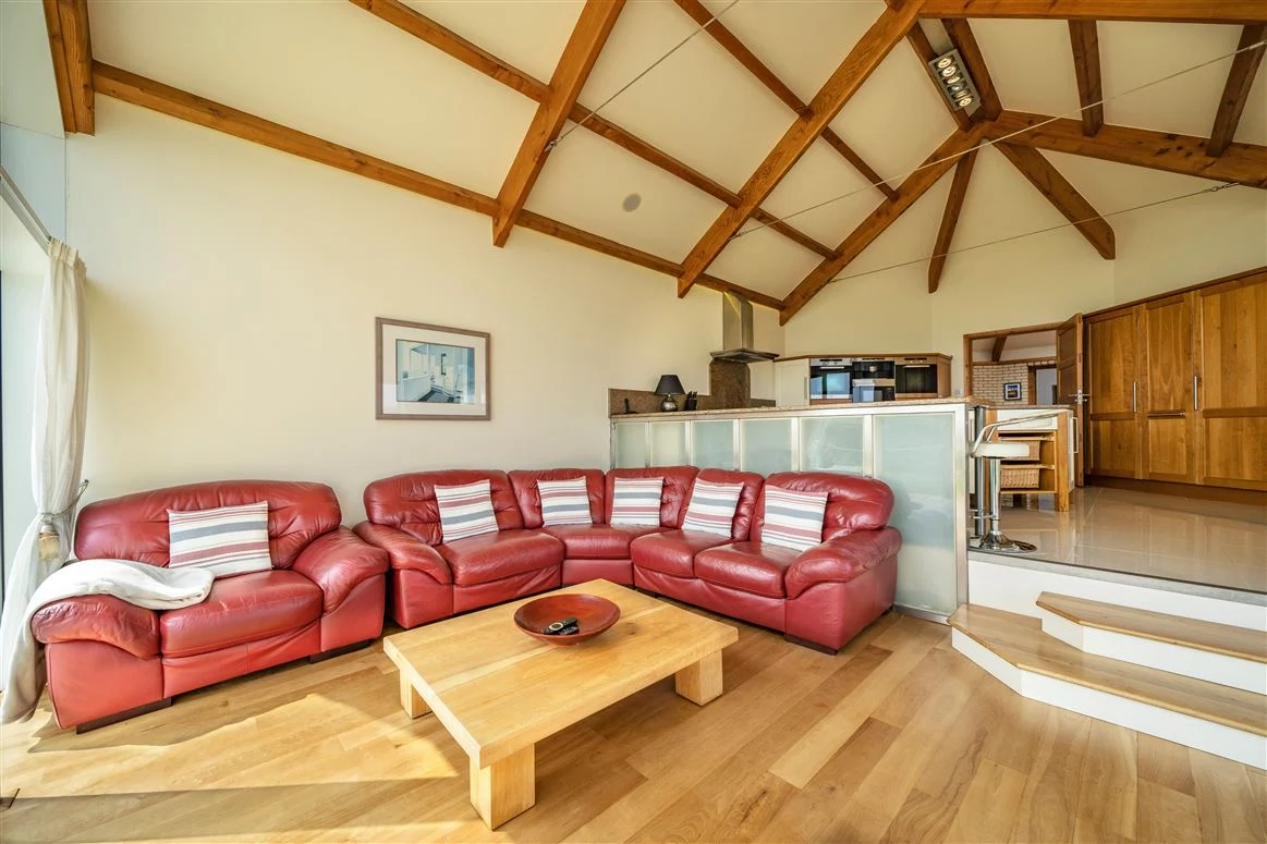 The main living room is an impressive space, with a double-height vaulted ceiling and a dual aspect thanks to large sliding doors and a gable end wall that is entirely glazed. This makes a real feature of the sea views, giving an almost 180 degree view, while a large stove creates a focal point in the space.