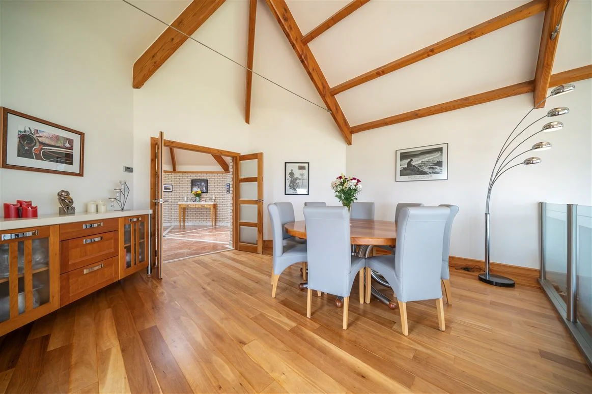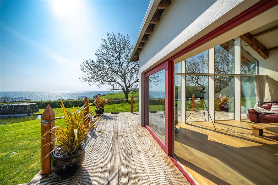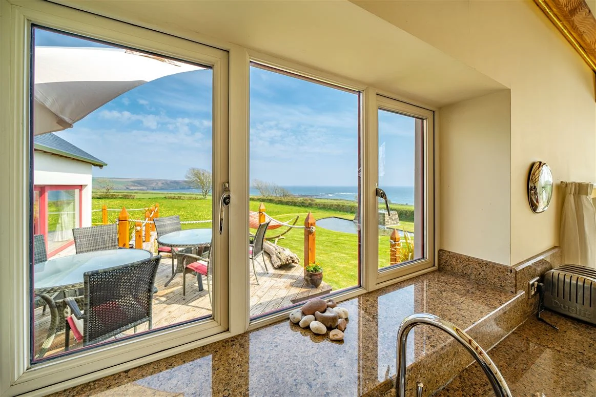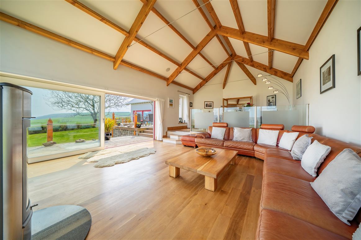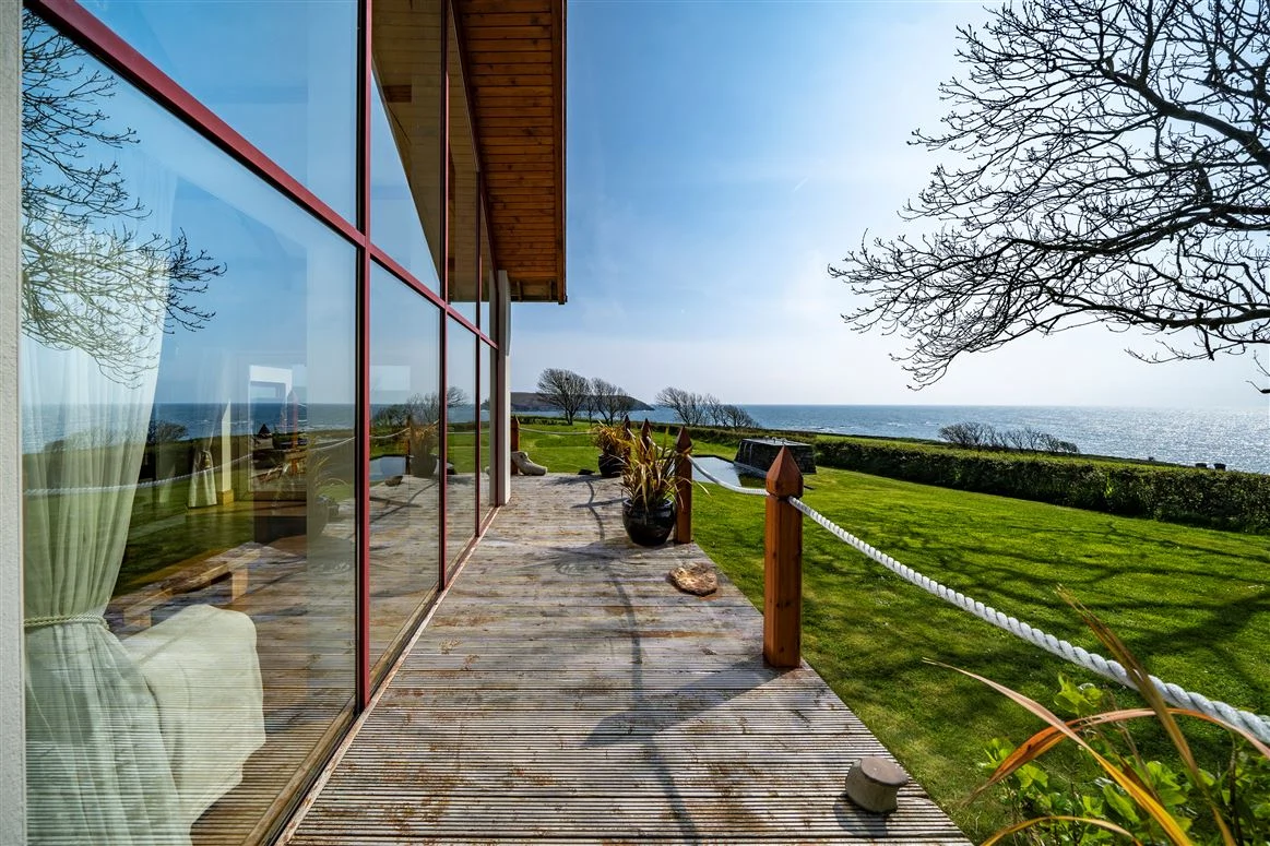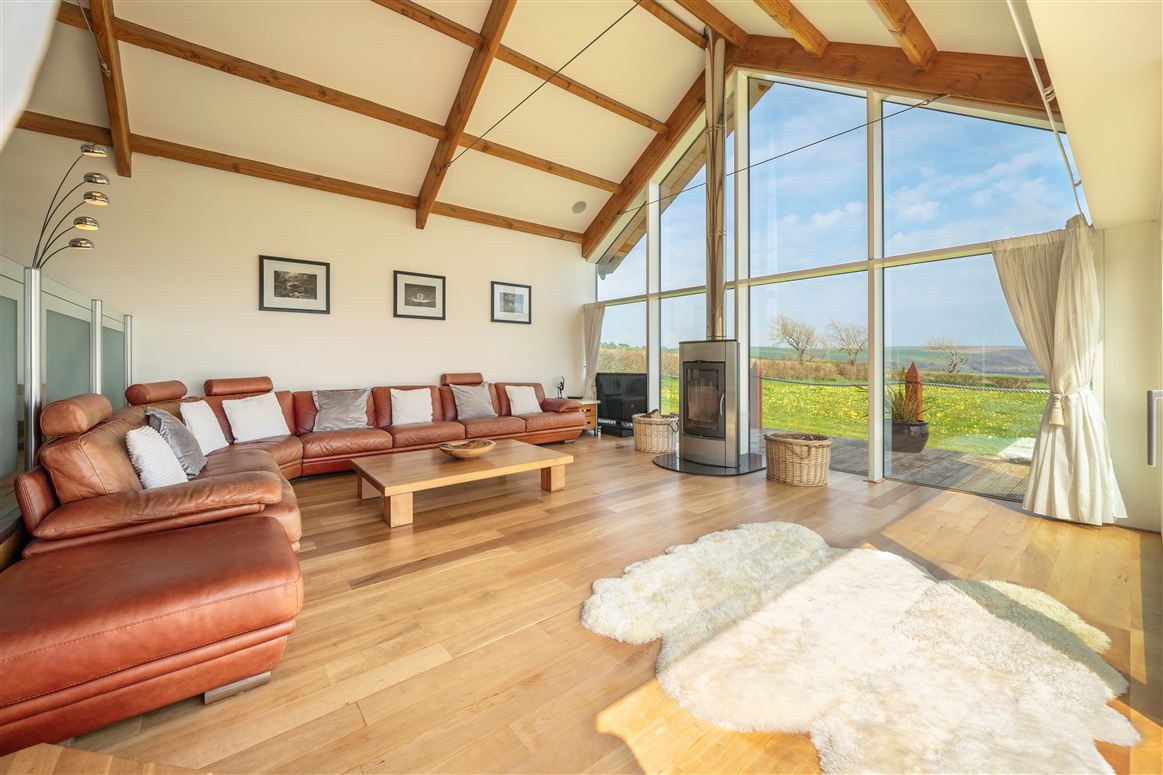 The main living room is an impressive space, with a double-height vaulted ceiling and a dual aspect thanks to large sliding doors and a gable end wall that is entirely glazed. This makes a real feature of the sea views, giving an almost 180 degree view, while a large stove creates a focal point in the space.