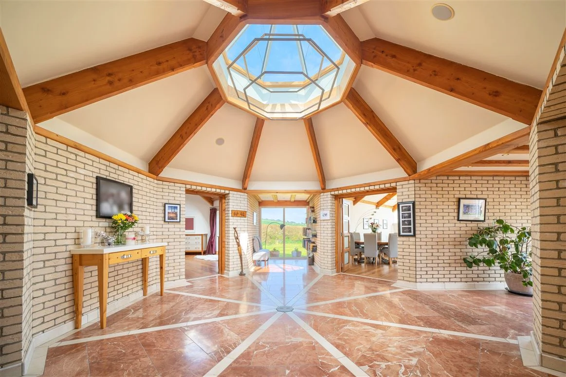 At the heart of this home sits an octagonal hallway with exposed beams and a skylight allowing light to flow in. This space leads to all the main rooms.