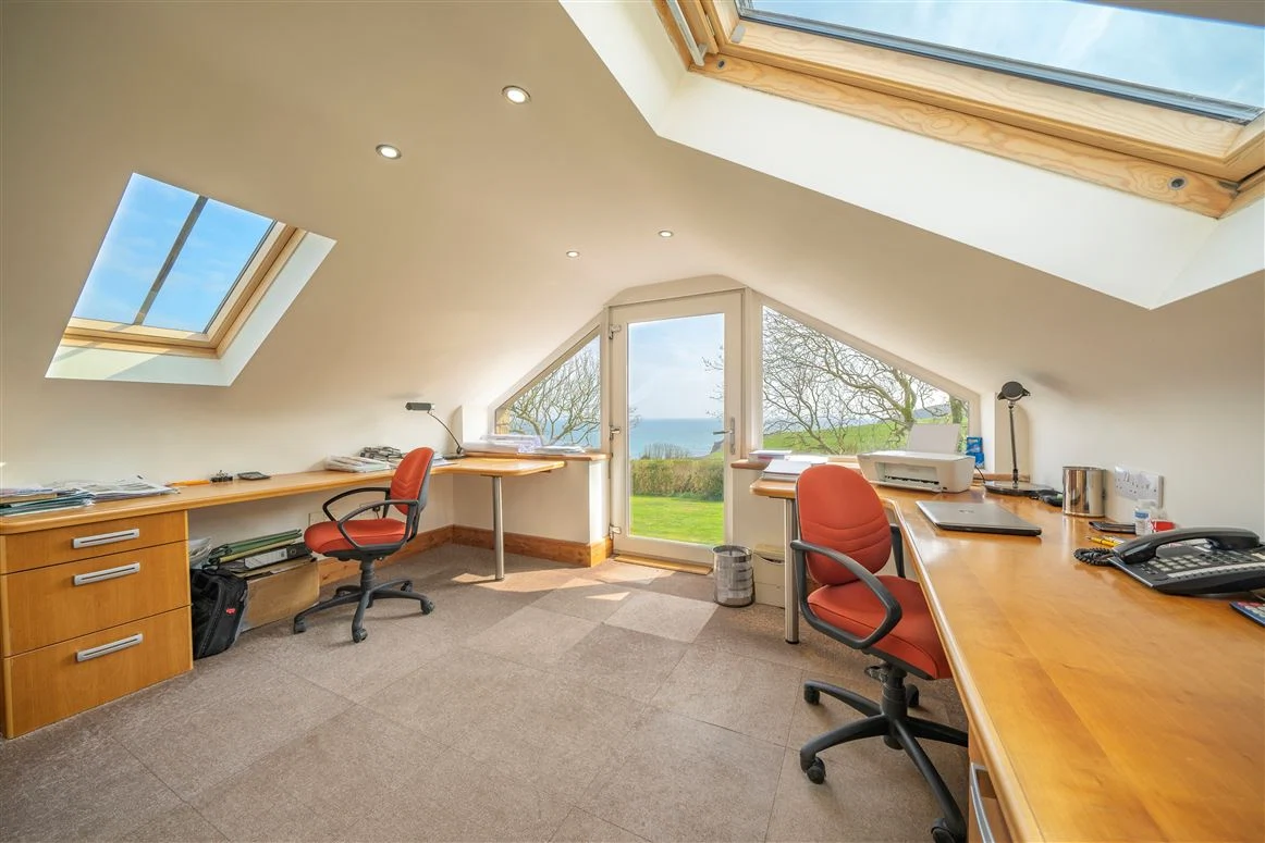 Three of the four bedrooms have en-suite bathrooms, while there is an attic room that is currently used as a home office.