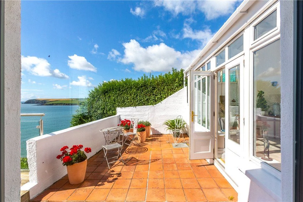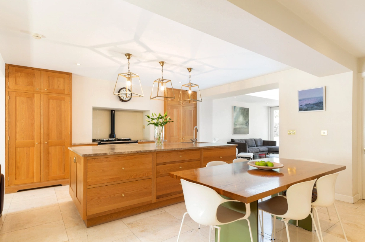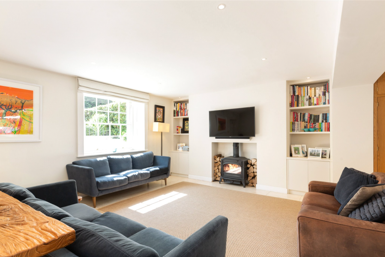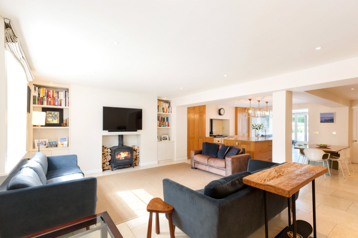 The kitchen has bespoke oak units, a large island and an Aga. The family room has a wood-burning stove, while an additional seating area is bright thanks to sliding glass doors that lead out to the garden, as well as a skylight. There is also a utility room on this level.