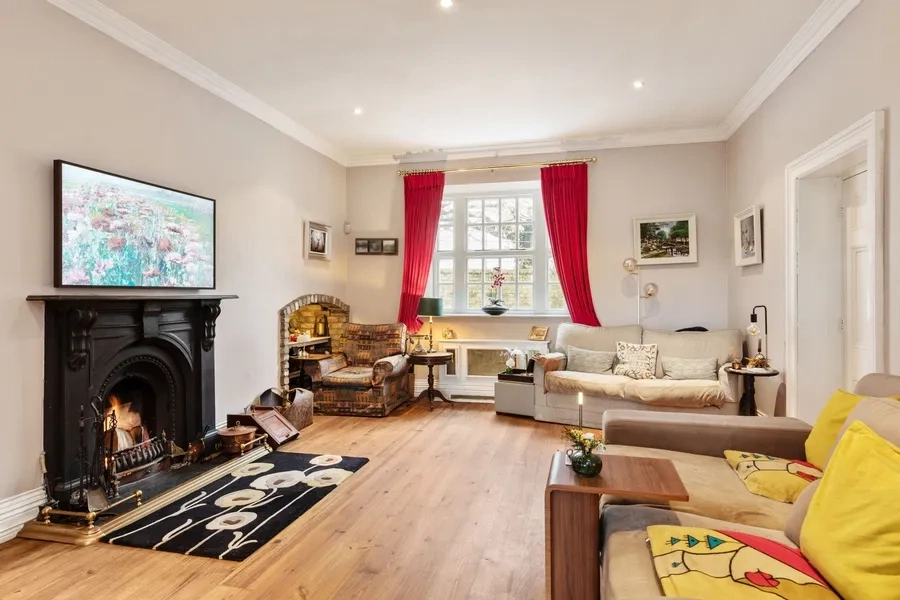 The ground floor accommodation comprises a bright and spacious entrance hall, a drawing room and a dining room. A wonderful feature staircase winds its way to the first floor. A large window to the rear of the house floods the space with natural light. The formal drawing room to the left and dining room to the right are nearly mirror images – both with high ceilings, dual elevations and feature fireplaces.