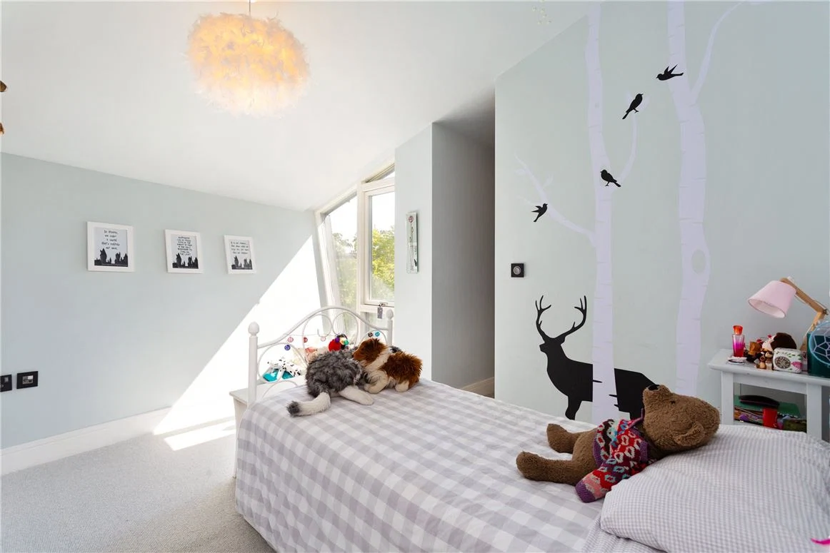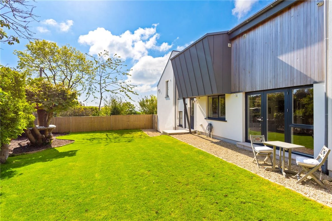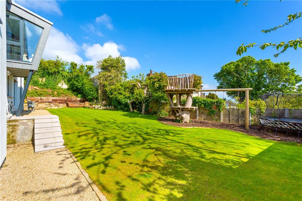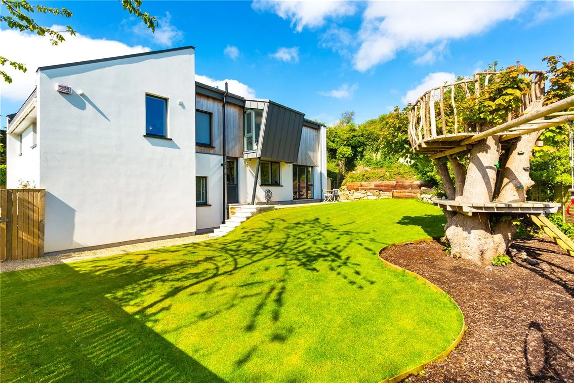 Outside, the carefully landscaped gardens add to the home’s appeal, with planted beds, trees, and a lawn area. There is also a bespoke treehouse and a swing set.
