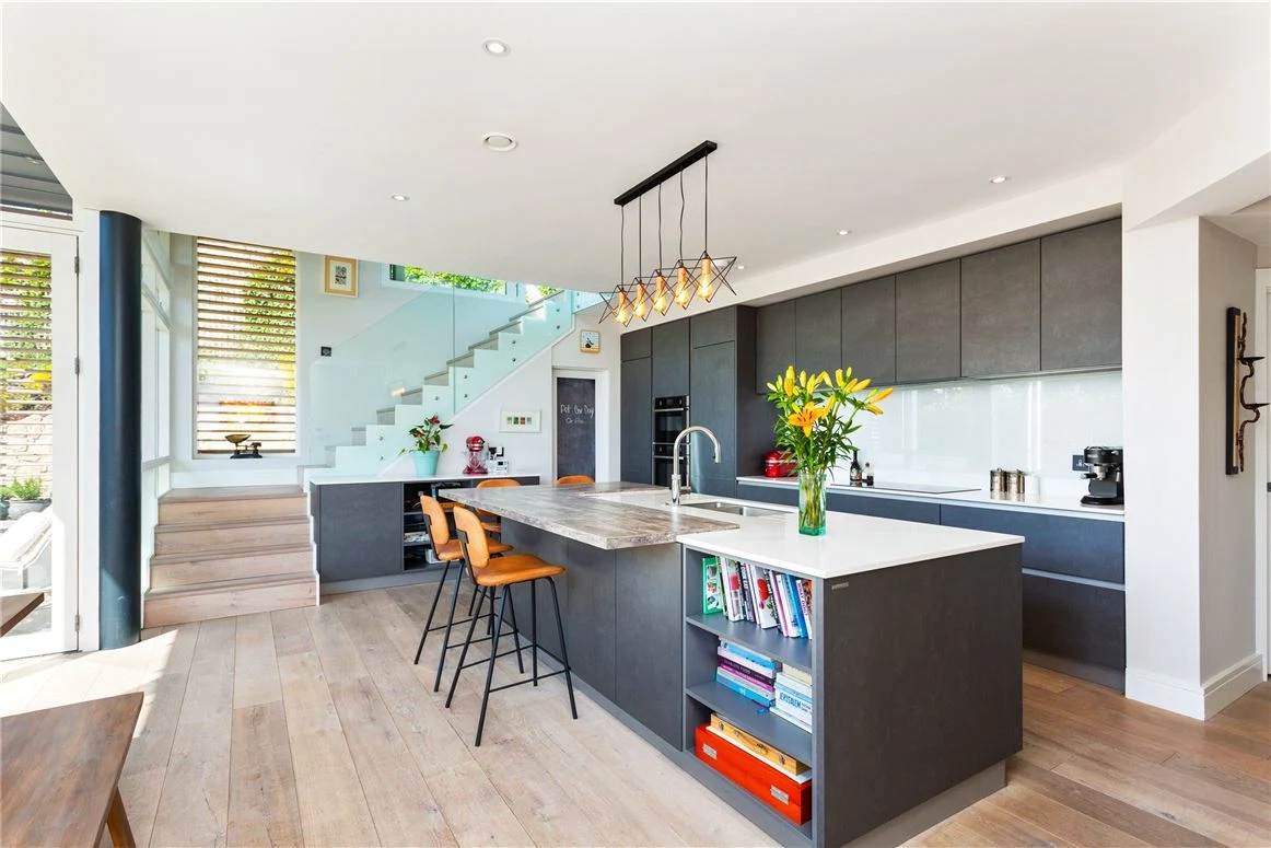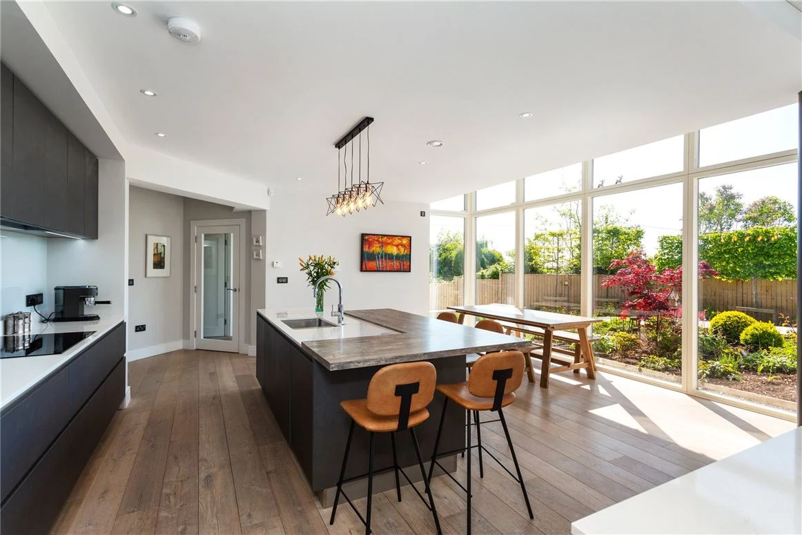 The large kitchen, measuring over 24 square metres, is one of the main spaces in this home. With custom-designed units, a breakfast bar, and quartz worktops, it feels sleek and modern.