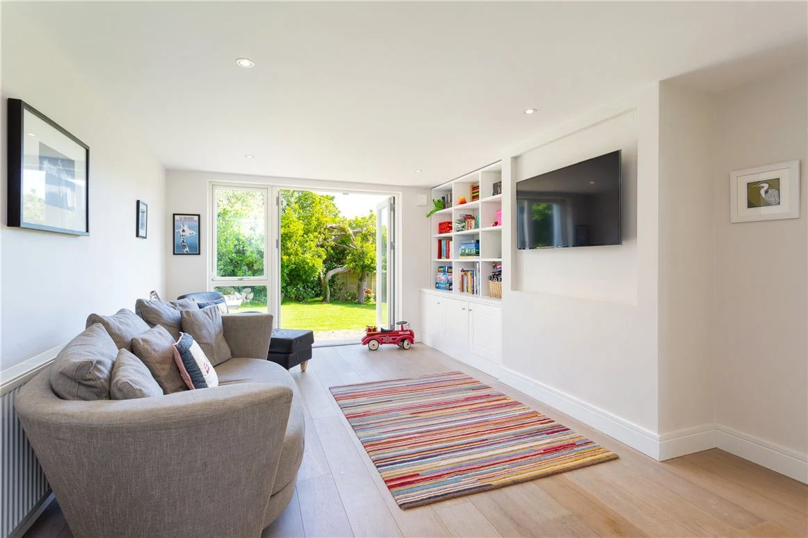 There is space for a large dining table beside the floor-to-ceiling windows that look out to the garden, and as well as the plentiful storage space in the kitchen itself, there is also a separate walk-in pantry.