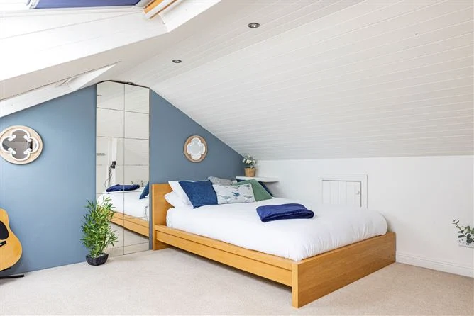 Stairs from the landing lead to the converted attic space with walk-in storage and Velux windows that allow natural light to flood the space by day.