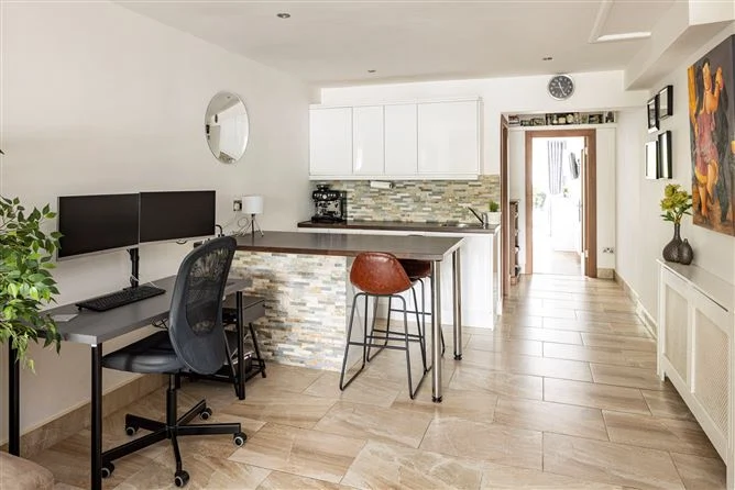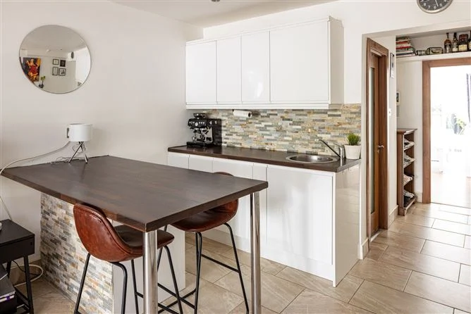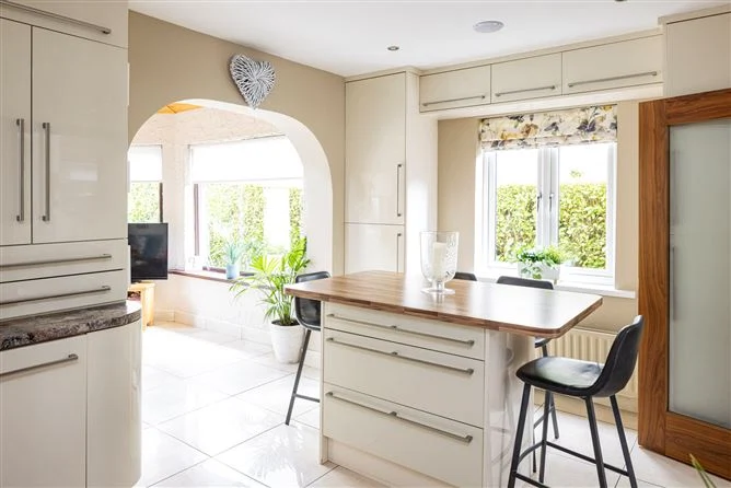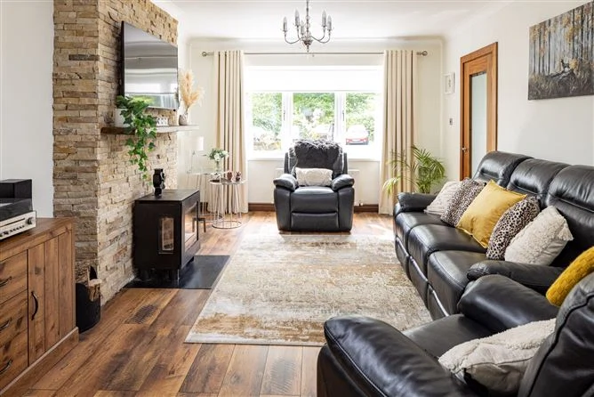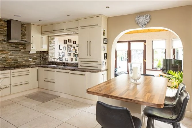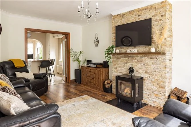 The entrance hall is a warm and welcoming space with tiled flooring and a storage press for coats and shoes. Further inside is the living room, characterised by laminate flooring and a feature wood-burning stove. Modern glass panel doors connect this space with the kitchen-cum-dining room.