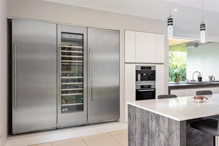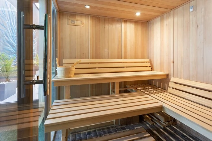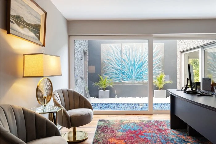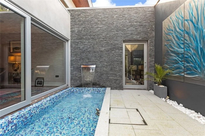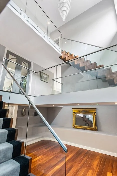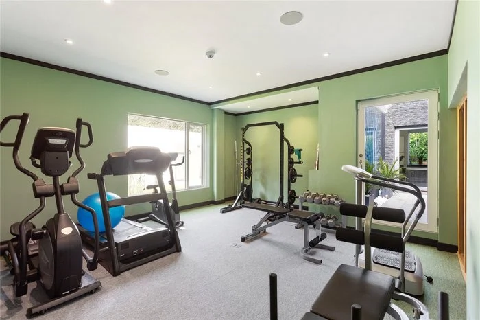 The kitchen is full of high-end fixtures and appliances, including granite worktops, a fridge for wine storage, and a built-in coffee machine. There is an additional chef’s kitchen, for extra prep space. Next to the kitchen is the gym, a large space that could also be used as another reception room, and also features a sauna, while a study on this floor looks out to an internal courtyard with a water feature.