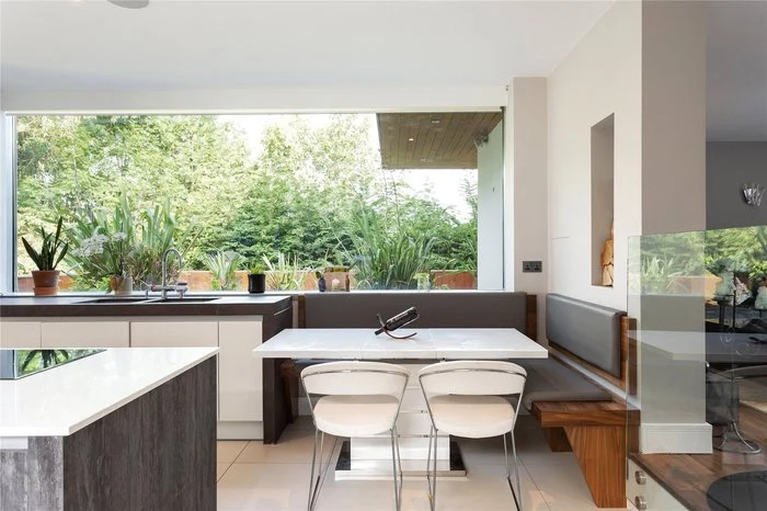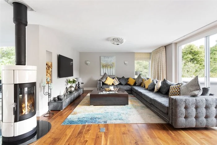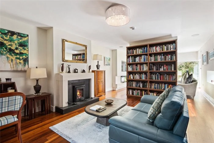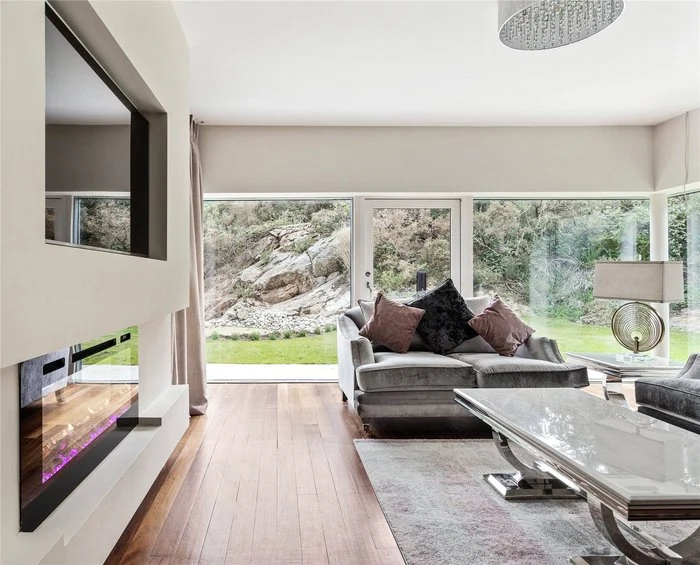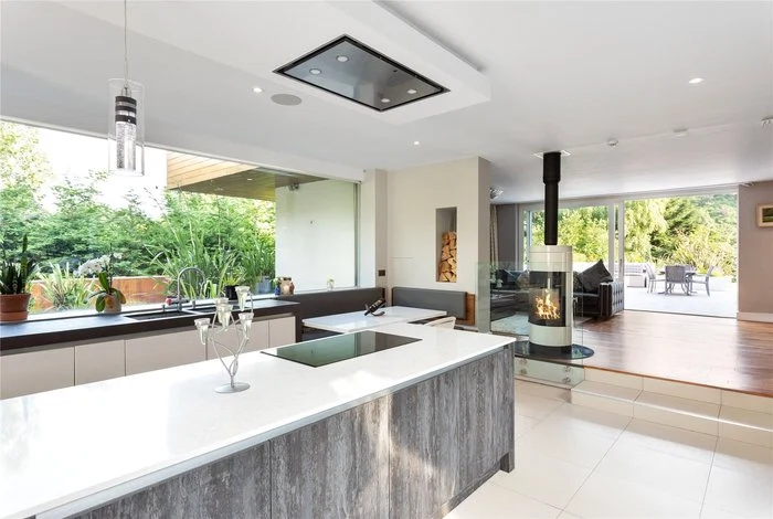 The dining room has a herringbone walnut floor and cast iron fireplace, while the family room has amazing mountain views and an Italian circular solid fuel stove. This space opens up to the adjacent kitchen, making it perfect for entertaining.