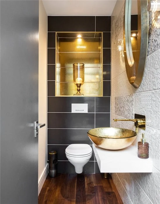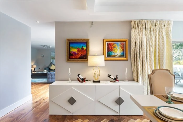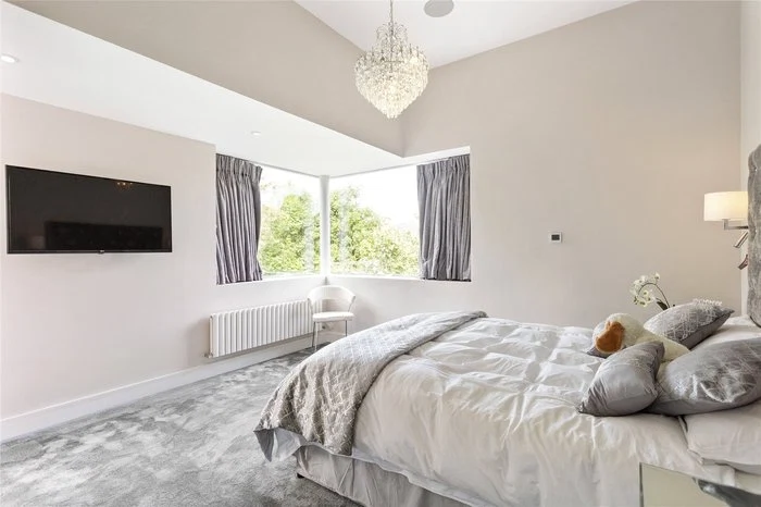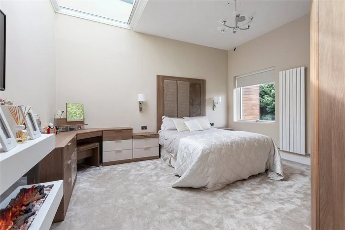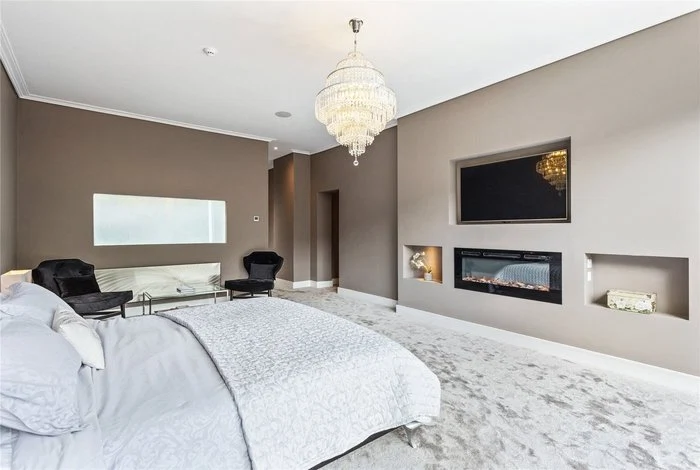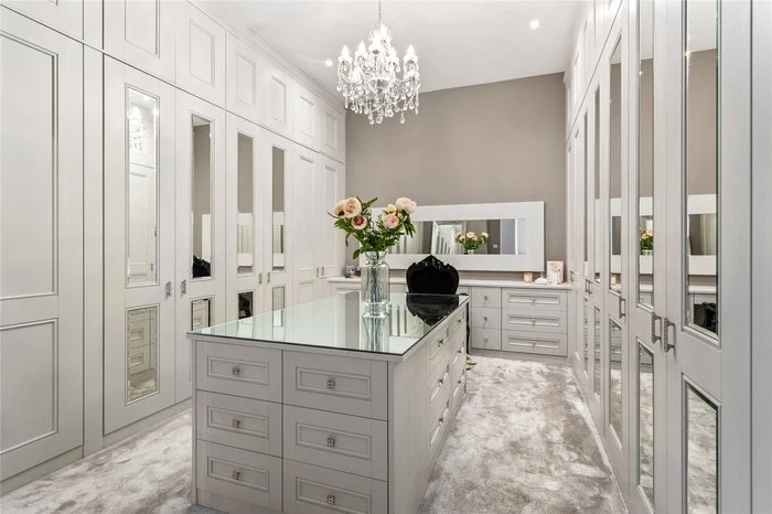 Upstairs, there are five bedrooms. The main bedroom has a walk-in wardrobe, fitted with Swarovski crystal handles and a large central mirrored island unit. It also has a laundry chute inside the wardrobe.