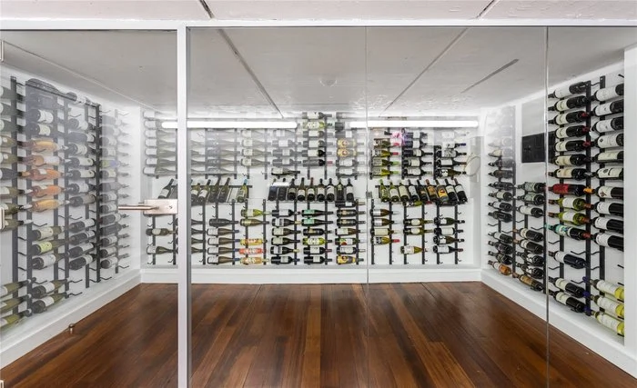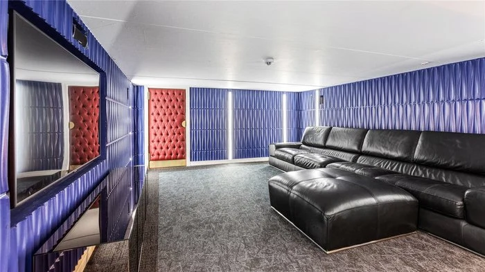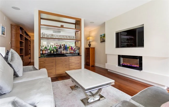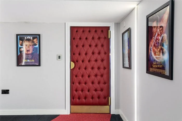 On the basement level is the cinema room, which seats ten people. It features a leather button-backed door, full acoustic panelling, surround sound, and a built-in bar. There is also a wine cellar and laundry room on this floor.