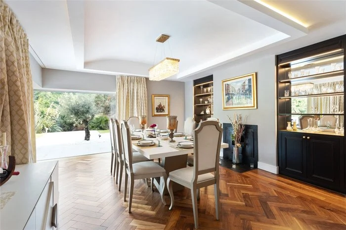 On the ground floor, you enter into a particularly large hallway, which has storage and a W.C. to the side. There are several reception rooms, including a living room, family room, and dining room. The living room has bespoke library shelving, a marble fireplace, a feature window, and doors to the patio and garden.