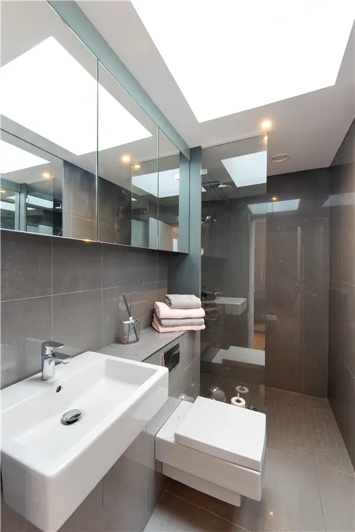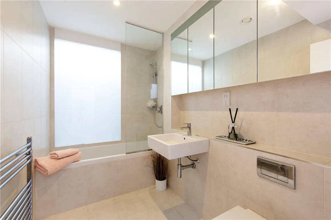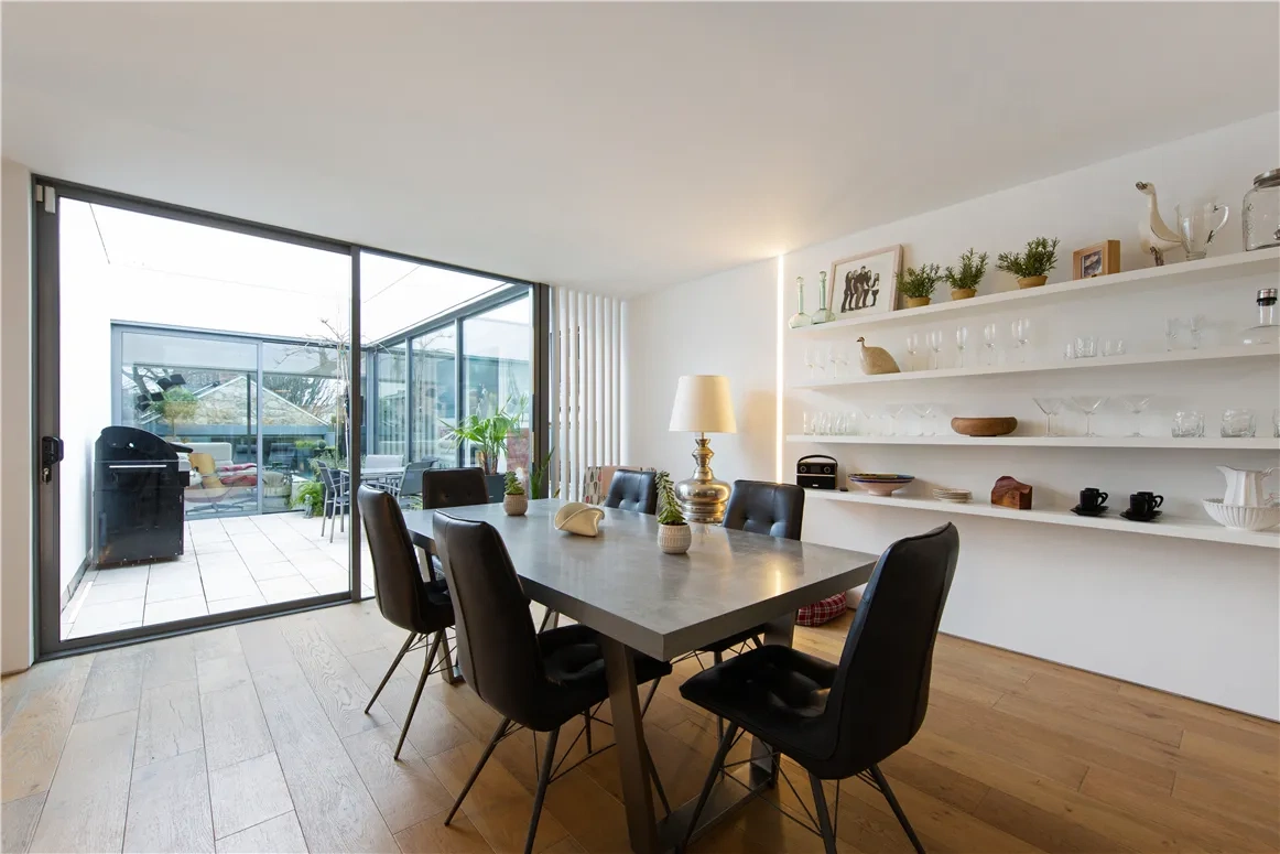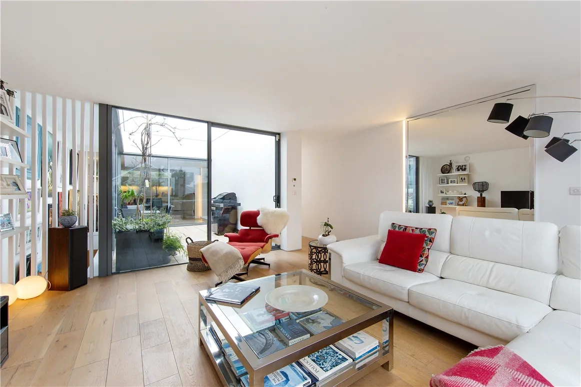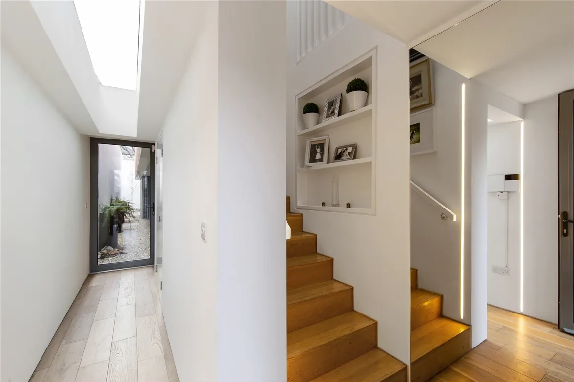 You enter the home into a hallway with solid oak flooring and a staircase to the first floor. Feature lighting, a light well and a floor to ceiling mirror mean light is diffused around the space, making it feel calm and welcoming.