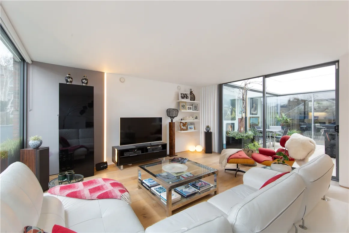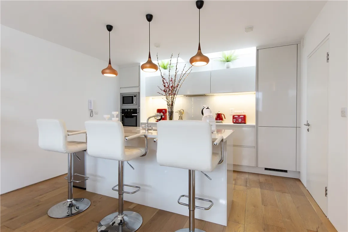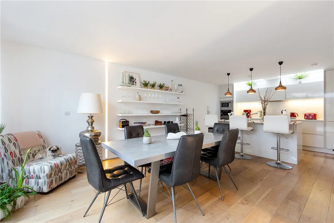 The kitchen has wide plank oak flooring, white gloss units, a quartz countertop, and a large island, and there is also a large space for a dining table. Off this space sits a utility room. The double aspect living space is bright throughout the day, and has a clean finish thanks to its white walls.